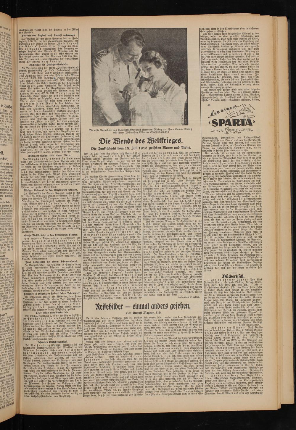 Die deutsche Oberste Heeresleitung stand dem Ereignis bes 18. Juli nicht ungewarnt gegenüber. Sie hatte baraufhin Abwehrmaßnahmen angeordnet, aber Anträgen aus den Armeeoberkommandos auf Bewilligung von Verstärkungen hatte sie sich versagen müssen. Als dann der 14. Juli, der französische Nationalfeiertag, für den man auf Grund der Gefangenenaussagen den Angriff erwartet hatte, verstrichen war, empfand die Führung bie Lage als gebessert und sah einen Großangriff nicht mehr als wahrscheinlich an. Zudem zog bas AOK. 9 einen Antrag auf Ueberweisung von vier Divisionen zurück. Dann war am 15. die deutsche Führung selbst zum Großangriff um Reims geschritten. Am frühen Morgen bes 18. Juli erreicht bie Truppe in der vordersten Linie ein neuer Ruf bes Schicksals, aber er kommt zu spät, um noch dorthin zu dringen, wo das Hirn der deutschen Kriegführung seinen Sitz hat: ins Große Hauptquartier in Aoesnes. Gegen 4.15 Uhr morgens laufen beim 3. Bayerischen Infanterie-Regiment zwei französische Infanteristen über. Sie sagen aus, baß zwischen 5 und 6 Uhr auf breiter Front ein großer Angrif zwischen Marne und Aisne erfolgen werde. Sie sind kriegsmüde und wollen „ nicht mehr mitmachen". An dieser Stelle ist das Feldtelephon an diesem Morgen gestört. So erfährt das Bataillon erst um 4.45 Uhr, das Regiment um 4.50 Uhr, die Brigade um 5 Uhr, die Division um 5.10 Uhr, was der Kompanieführer um 4.30 Uhr gehört hat. Und ehe das Gruppenkommando, das Armeeoberkommando und bie Heeresgruppe auch nur eine Ahnung haben, kracht es vorn an der Front aus Tausenden von Geschützen, sind die feindlichen Sturmbataillone, hinter Hunderten von Tanks her, denen die Feuerwalze vorauseilt, über die deutschen Vorposten, über die Hauptwiderstandslinie hinweg, tief in die Stellungen der 9. und der 7. Armee eingebrochen.