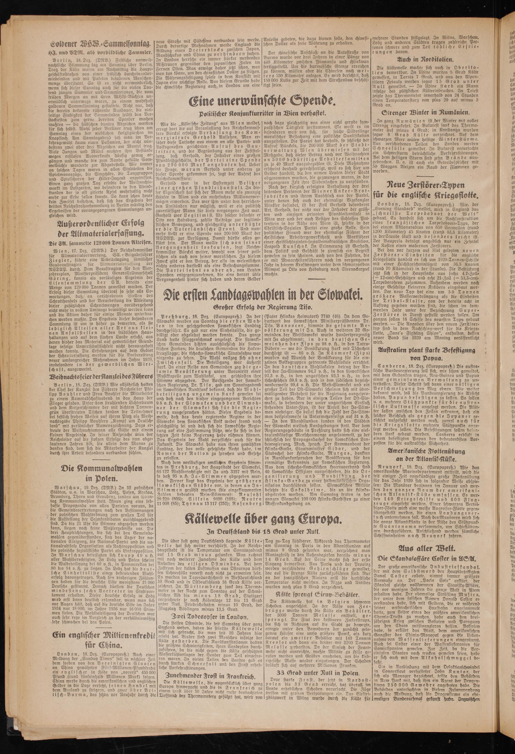 noch dazu gleichzeitig von einer nicht gerade sympathischen Tätigkeit herstammen. Sie weist es im besonderen weib von sich, für solche Silberlinge moralischer Bestechung eine politische Qualifikation auszustellen. Die Partei hat deshalb, so schließt der Ausruf Bürckels, die 200 000 Mark der Stadtverwaltung Wien überwiesen mit der Maßgabe, daß dieser Betrag noch vor Weihnachten an 5000 bedürftige Arbeiterfamilien zu je 40 Mark auszubezahlen ist. Diese Maßnahme erscheint deshalb gerechtfertigt, weil es sich hier um Gelder handelt, die den armen Leuten dieser Stadt abgenommen wurden, die gezwungen waren, in der vergangenen Zeit ihre Siebensachen zu verpfänden.
