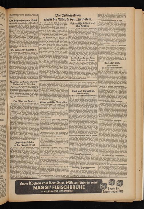 Jerusalem, 20. Dtt (DNB. Funkspruch.) Zur Lage in Jerusalem erklärt der amtliche englische Bericht, die Truppen hätten am Dienstag ein Gebiet in Brette von einem Kilometer um die Altstadt gesäubert. Am Mittwochmorgen gegen 4 Uhr sei die M i I i t ä r f e 11 e um d i e Alt - stadt geschlossen worden. Das Stefan- und das Damaskustor, die verbarrikadiert waren, seien aufgebrochen worden. Zwei Stunden später seien die Truppen in die Stadt eingedrungen, und gleichzeitig habe die Polizei mit einer Durchsuchungsaktion begonnen. Der Widerstand der Araber sei nicht allzu stark gewesen. Im Verlaufe der Schießerei sei ein Soldat schwer, ein anderer leichter verletzt worden. Die Truppen hätten gegen neun Uhr die Kontrolle über d i e A l t st a d t gehabt. Die Zahl der toten und verwundeten Araber sei noch nicht endgültig bekannt. Bis 14 Uhr seien a ch t Tote, darunter eine Frau, drei Schwerverletzte und 15 Leichtverletzte gemeldet worden. Zahlreiche Araber seien in das Gebiet der Omar-Moschee geflüchtet. 40 Araber seien wegen Uebertretens des Ausgehverbots verhaftet worden. Die Aktion werde voraussichtlich am Donnerstag abgeschlossen werden. Wie verlautet, soll nach der Aktion gegen Jerusalem nun auch gegen andere Städte, vor allem gegen Jaffa und Nablus, scharf vorgegangen werden. Man rechnet damit, daß die Gesamtaktion zur Unterdrückung der Freiheitskämpfer innerhalb von zwei Wochen im ganzen Lande durchgeführt sein kann. Der Oberkommissar hat eine neue Verordnung erlassen, nach der die Zahl der Personen, die zum Waffen trag en berechtigt sind, erhöht werden kann. Mit dieser Bestimmung ist anscheinend die Absicht verbunden, zur Unterstützung des Kampfes gegen die arabischen Freiheitskämpfer vor allem jüdische Kreise zu bewaffnen. Zweitens setzt die neue Verordnung fest, daß der Besitz von Personen, die sich an Vergehen politischer Art beteiligen ober sonst gegen Sicherheitsbestimmungen verstoßen, be° schlagnahmt oder zerstört werden kann.