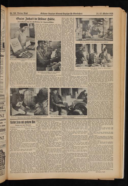 Tabak bis zum Raucher zurücklegen muß, daß es Immer fällt, in einem Aufsatz von 150 Druckzeilen aurf) nur zu umreißen, was es an durchaus interessanten Einzelheiten zu berichten gibt. Man muß fid) also schon weise Beschränkung auferlegen So fiel uns denn, dank der Anregung durch eine Zigarre, ein, sich einmal mit den Stadien der Entwicklung eines Zigarrenkistchens zu beschäftigen. Um etroas Darüber zu erfahren, lenkten wir unsere Schritte nach Heuchelheim, wo allein in der Abteilung „Zigarrenkistchen-Herstellung" der Firma Rinn 6- Cloos rund 300 Menschen beschäftigt sind. Mit dieser großen Gefolgschaft ist diese Abteilung des Betriebes wohl die größte Zigarrenkistchenfabrik Deutschlands Aus artigerem Raum