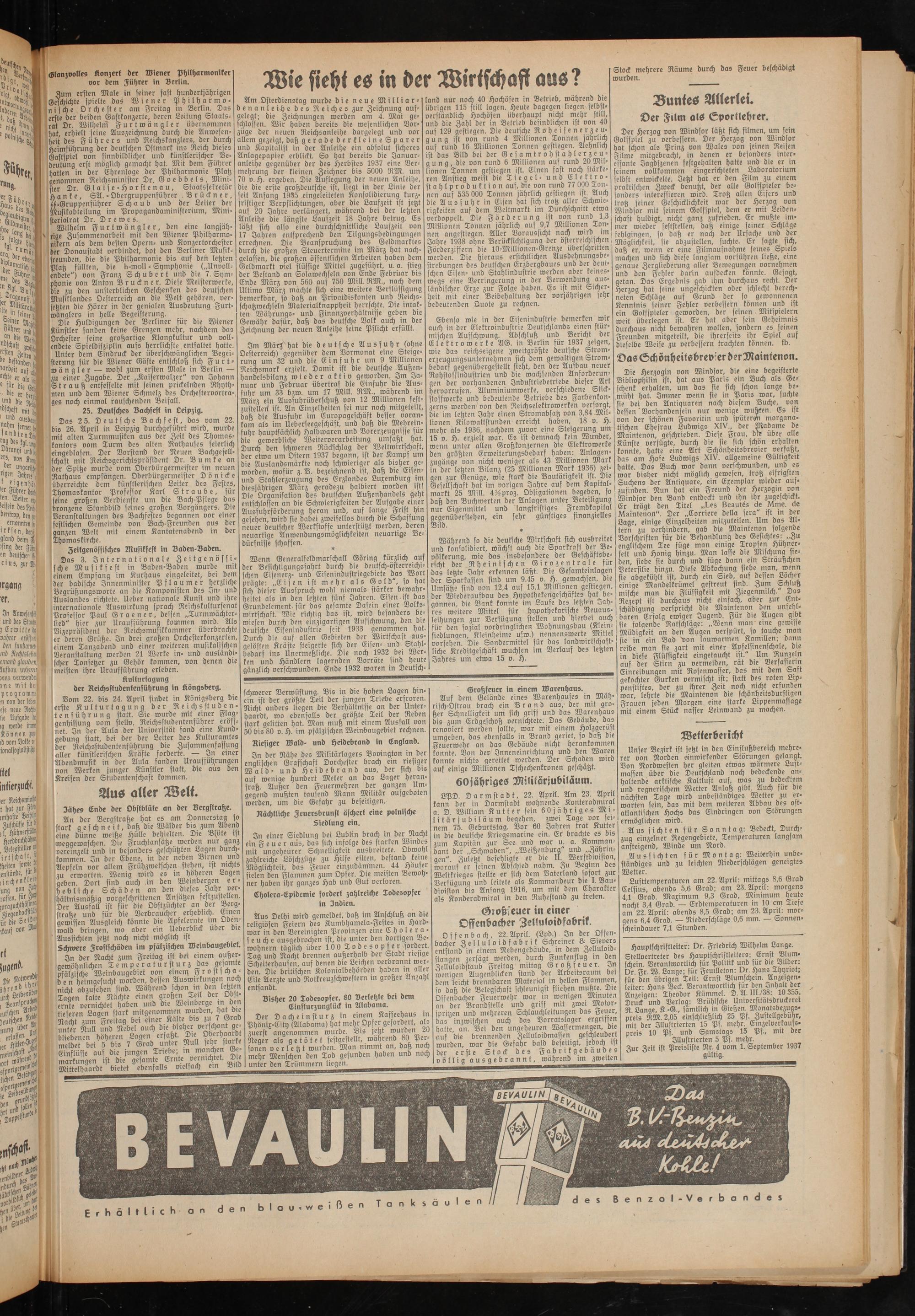 Hauptschriftleiter: Dr. Friedrich Wilhelm Lange. Stellvertreter Des Hauptschriftleiters: Ernst Blum* schein. Verantwortlich für Politik unD für Die Bilder: Dr Fr W. Lange; für Feuilleton: Dr. Hans Thynot; für Den übrigen Teil: Ernst Blumschein. Anzeigen- (eiter: Hans Beck. Verantwortlich für Den Inhalt Der Anzeigen: TheoDor Kümmel. D. A. III./38: 10 355. Druck unD Verlag: Brühlsche UniDerfitätsDruderet R Lange, K -G., famtlich in Gießen. Monatsbezugs- preis RM. 2,05 einschließlich 25 Pf. Zustellgebühr, mit Der Illustrierten 15 Pf. mehr. Einzelverkaufs- preis 10 Pf. und Samstags 15 Pf., mit Der