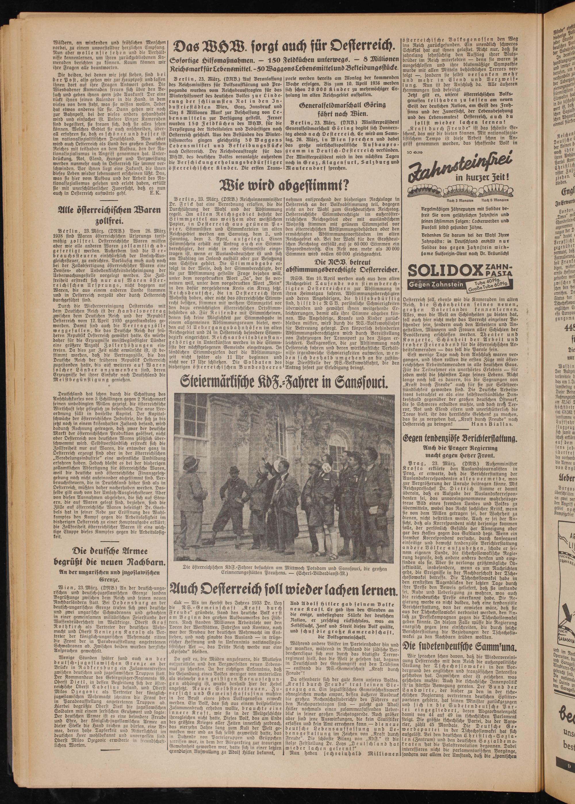 NSG. Arn 10. April werden auch aus dem alten Reichsgebiet Tausende von stimmberech- tigten Oesterreichern zur Abstimmung in ihren Heimatgau fahren. Abstimmungsberechtigten und deren Angehörigen, die hilfsbedürftig sind, h ilst d i e NSV. persönliche Schwierigkeiten überwinden und gewährt ihnen weitgehende Erleichterungen, damit alle ihre Stimme abgeben können. Wo Angehörige, Kranke und Kinder Zurückbleiben müssen, wird durch die NS.-Volkswohlfahrt für Betreuung gesorgt. Den körperlich behinderten Abstimmungsberechtigten wird durch Bereitstellung von Fahrzeugen der Transport zu den Zügen erleichtert. Volksgenossen, die zur Abstimmung nach Oesterreich fahren und deren wirtschaftliche Verhältnisse- irgendwelche Schwierigkeiten aufweisen, w e n- den sich deshalb umgehend an die zuständige Dienststelle der NS.-Volkswohlfahrt, die den Antrag sofort zur Erledigung bringt.