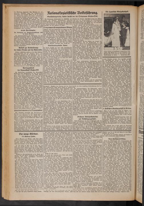 Ortsgruppen-propagandawartBlinzig eröffnete nach dem Einbringen der Fahne die Versammlung, erinnerte an das Jahr 1937 als an ein Jahr des Erfolges, das Deutschland stolz, mäch- tig, gleichberechtigt unter den Völkern, national und sozial gefestigt sah. Die Ortsgruppe Gießen-Süb habe zu ihrem Teil zu den Erfolgen beigetragen. Der Provagandawart bat abschließend die Mitarbeiter, nicht müde zu werden im großen Dienst, den neuen Mitgliedern gegenüber sprach er die Erwartung aus, daß sie bald tätig werden möchten.