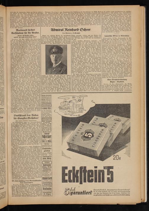 Wir wissen, daß diese Maßnahmen zu dem ruhmreichen Waffengange vor dem Skagerrak führten. Hier bewährte sich Scheer als der große Flotte n f ü h r e r, der sich auch durch die Uebermacht des Gegners, die erst während der Schlacht erkannt wurde, nicht schrecken und das Gesetz des Handelns sich vom Feinde nicht aus der Hand nehmen ließ. Seinem unbändigen Angriffswillen und feiner mutigen Führung verdanken wir den Erfolg des Tages. Daß der Sieg nicht ausgenutzt wurde, und daß es später nicht mehr zu einem Kampf der beiden Flotten kam, hat nicht an ihm gelegen Schon sechs Wochen nach Skagerrak bot er den Engländern unfern der englischen Küste eine neue Schlacht