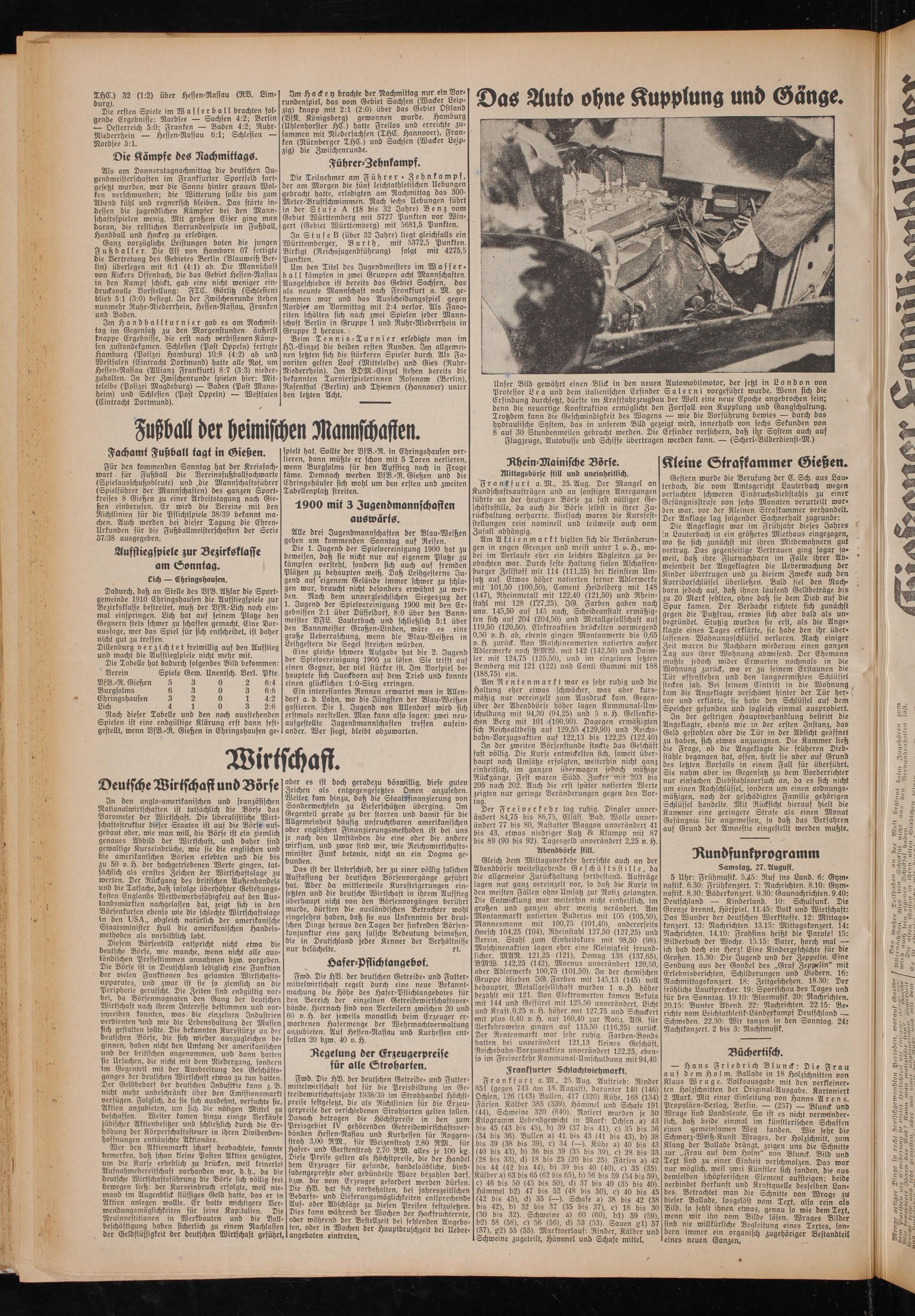 Frankfurt a. M., 25. Aug. Auftrieb: Rinder 851 (gegen 743 am 18. August), darunter 140 (146) Ochsen, 126 (143) Bullen, 417 (320) Kühe, 168 (134) Färsen. Kälber 385 (339), Hämmel und Schafe 191 (44), Schweine 320 (640). Notiert wurden je 50 Kilogramm Lebendgewicht in Mark: Ochsen a) 43 bis 45 (43 bis 45), b) 39 (37 bis 41), c) 35 bis 36