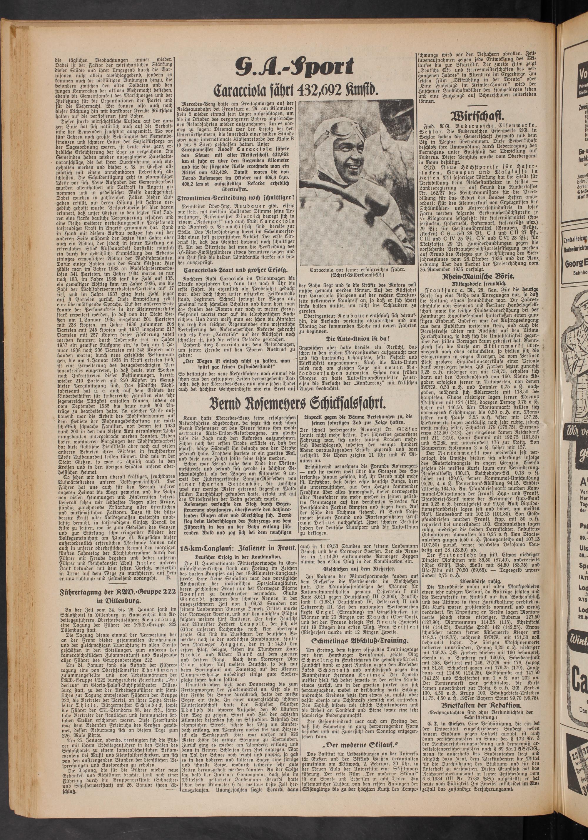 Erschütternd vernehmen die Freunde Rosemeyers — und sie waren weit über die Grenzen des Vaterlandes hinaus zahllos, daß ihr Bernd nicht mehr ist. Unfaßbar, daß dieser echte deutsche Junge, dem ein unverwüstlicher, aus dem Herzen kommender Frohsinn über alles hinweghalf, dieser verwegenste aller Rennfahrer nie mehr wieder in seinen geliebten Rennwagen auf den berühmten Strecken für Deutschlands Farben kämpfen und siegen kann. Auf der Höhe des Ruhmes stehend, ist Bernd Rosemeyer seinem Freund und Markengefährten Ernst von Delius nachgefolgt. Zwei schwere Verluste haben der deutsche Äutosport und b’c Auto-Union zu beklagen.