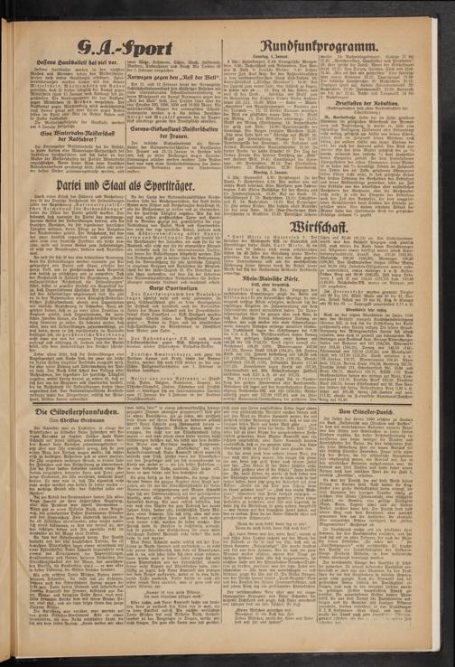 6 Uhr: Hafenkonzert. 8.10: Evangelische Morgenfeier. 8.50: Rechenschaft und Bekenntnis. Von Goswin P. Gath. 9: Deutsche Meister. 9.45: Dichter unserer Zeit. Karl Götz: Bei den Rußlanddeutschen in dem nordamerikanischen Staat Süd-Dakota. 10: Kater-Frühstück („Flüssige Melodien"). 10.30: Ruf der Jugend zum neuen Jahr. Gar fröhlich zu singen, so heben wir an... 11: Eng ist das Leben, und weit ist das Land... Hörfolge mit Musik zum 60. Geburtstag des Dichters Erwin Guido Kolben- Heyer (31.12.). 11.30: Affen — Kater — Möpse. Haustiere" am Neujahrsmorgen. — Kurioses aus der Tierwelt —. 12: 22 Länder Europas wünschen der Welt ein glückliches neues Jahr. 12.15: Musik am Mittag. 13: Das Mikrofon unterwegs. 13.15: Musik am Mittag (Fortsetzung). 14: Kasperlstunde für groß und klein: 14.30: Sportereignisse des Sonntags. Ein Reigen sorgloser Melodien. 15.30: „Das neue Jahr hebt an." Hörfolge mit Musik. 16: Musik zur Unterhaltung. Einlage 17 bis 17.10: Sportereignisse des Sonntags. 18: Volkstum und Heimat. Alemannischer Bauernkalender. 18.30: In froher Runde 'ne halbe Stunde! 19: Der Tag der kleinen Freude. Ein heiterer Vorschlag zur „Güte" von Herbert Witt. 19.45: Sportspiegel des Sonntags. 20: Nachrichten. 20.10: Das Christelflein. Spieloper. 22: Nachrichten. 22.20: Sportbericht.