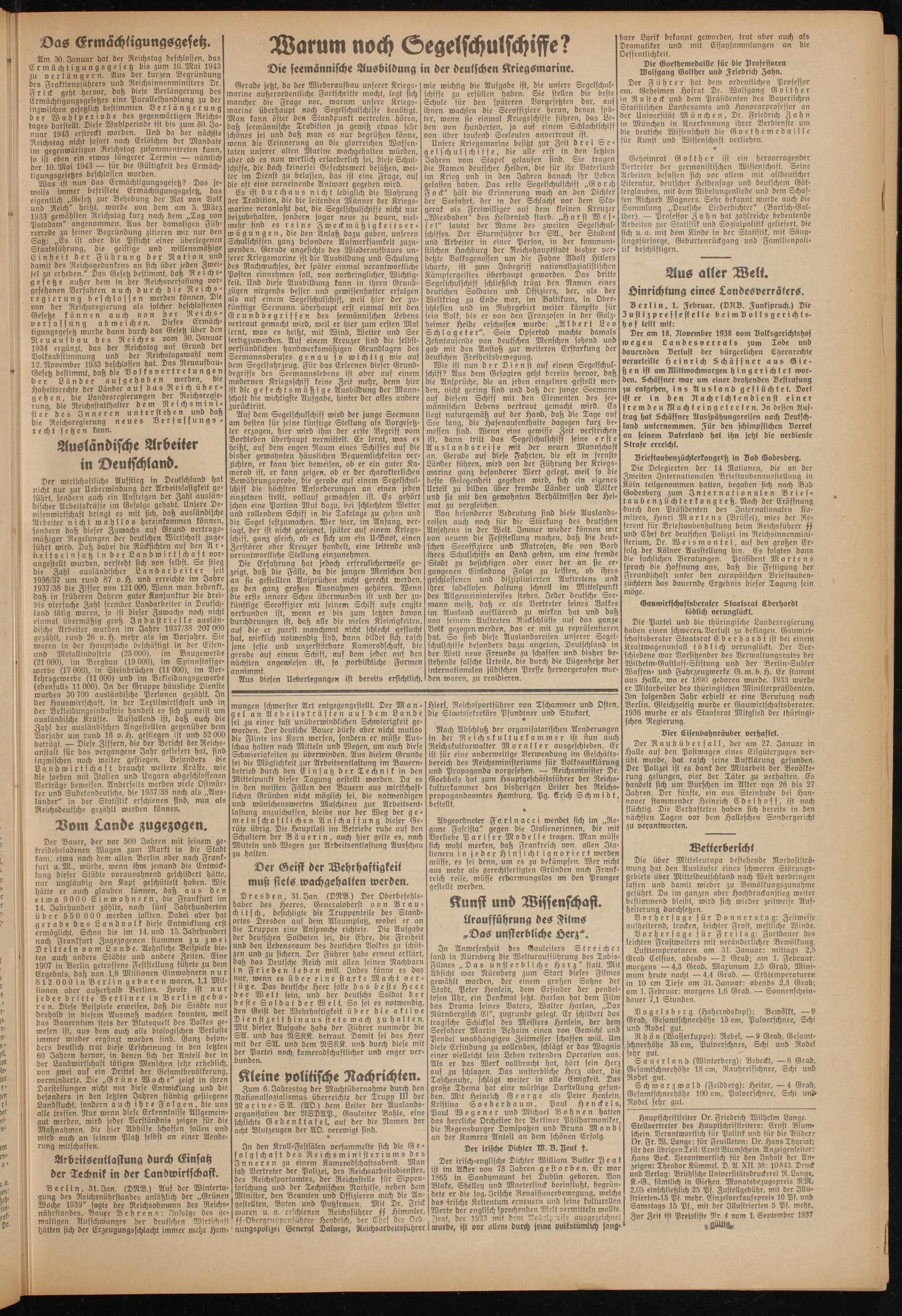 Der am 18. November 1938 vom Volksgerichtshof wegen Landesverrats zum Tode und dauernden Verlust der bürgerlichen Ehrenrechte verurteilte Heinrich Schäffner aus Gie - ; e n ist am Wittwochmorgen h i n g e r i ch t e t worden. Schäffner war um einer drohenden Bestrafung zu entgehen, ins Ausland geflüchtet. Dort ist er in den Nachrichtendienst einer remdenWachteingetreken. In dessen Auftrag hat Schäffner Ausspähungsreisen nach Deutschland unternommen. Für den schimpflichen Verrat an seinem Vaterland hat ihn jetzt die verdiente Strafe erreicht.