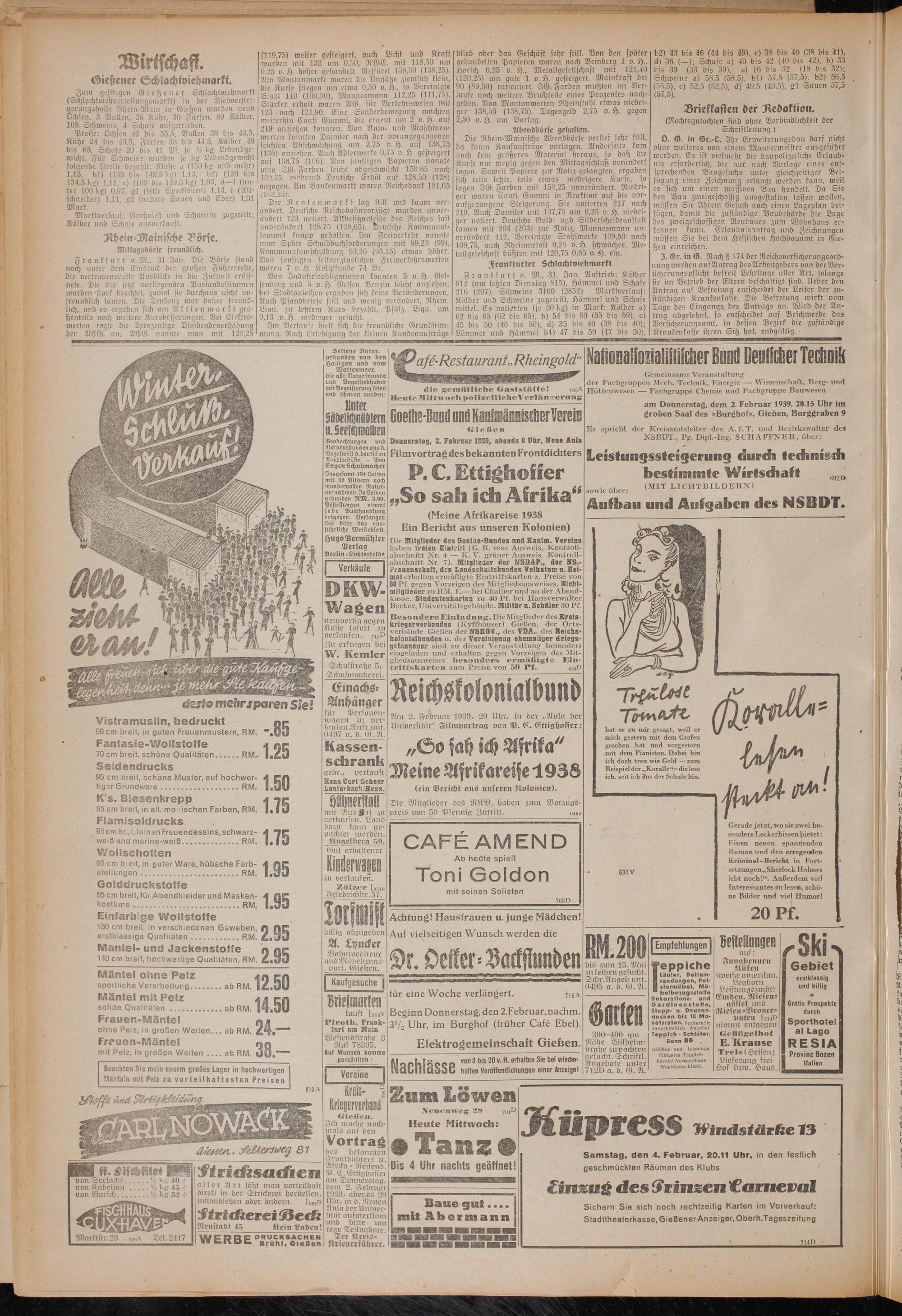 Vortrag des bekannten Frontdichters u. 'Afrika - Reisend. P. C.Gttighoßer am Donnerstag, dem 2. Februar 1939, abends 20 Uhr, in d. Neuen Aula der Universität aufmerksam und bitte um rege Teilnahme.