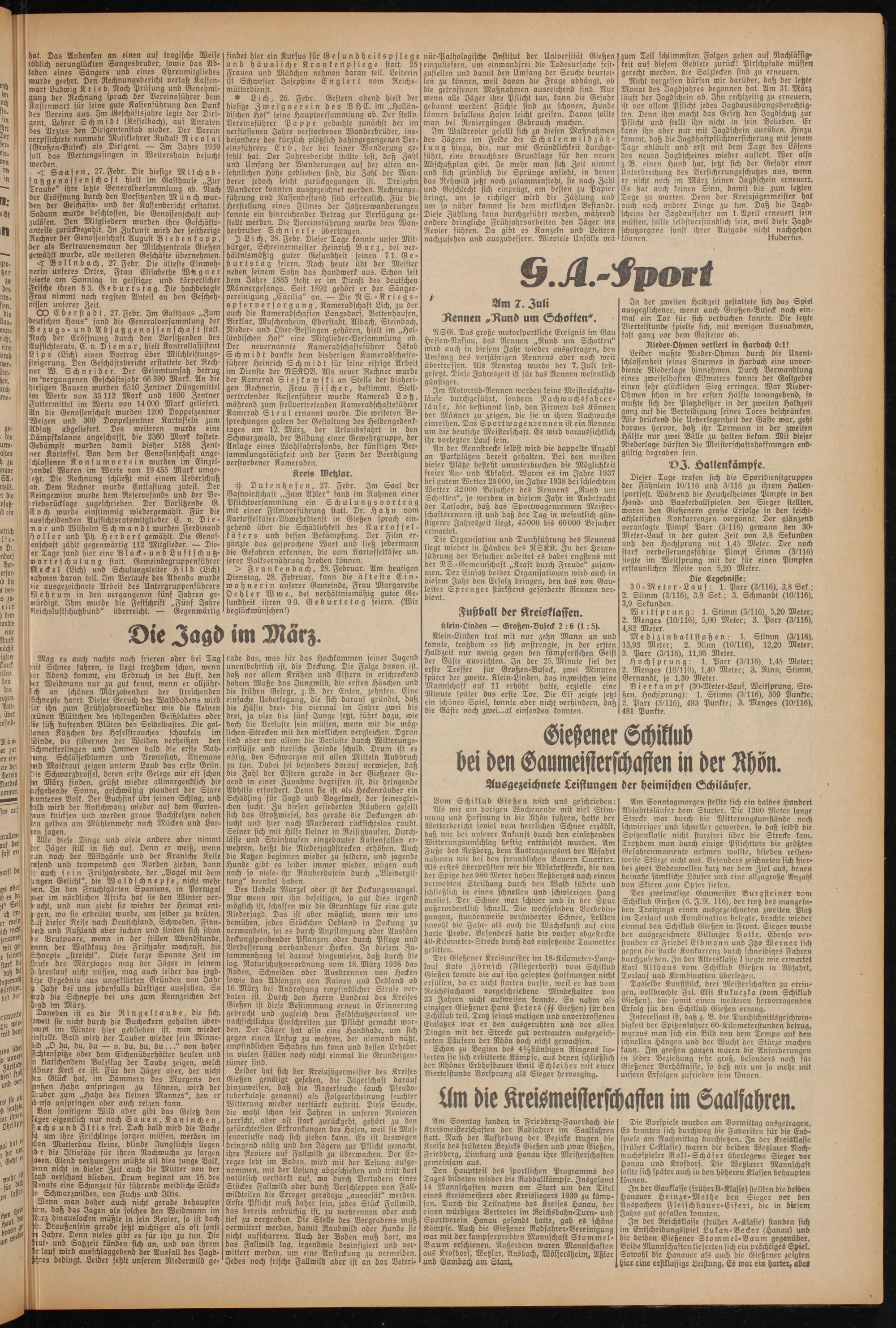 Der Gießener Kreismeister im 18-Kilometer-Lang- lauf Kato Zörnsch (Fliegerhorst) vom Schiklub Gießen konnte die auf ihn gesetzten Hoffnungen nicht erfüllen, da er nicht starten durste, weil er das vom Reichsfachamt vorgeschriebene Mindestalter von 23 Jahren nicht aufweisen konnte. So nahm als einziger Gießener Hans Peters (ff Gießen) für den Schiklub teil. Trotz seines mutigen und unverdrossenen Einsatzes war er den ausgeruhten und vor allen Dingen mit der Strecke gut vertrauten ausgezeichneten Läufern der Rhön doch nicht gewachsen.