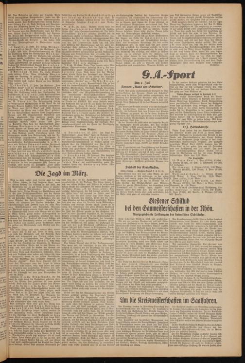 Dieser Tage trafen sich die Sportdienstgruppen der Fähnlein 10/116 und 3/116 zu ihrem Hallen- sportfest. Während die Heuchelheimer Pimpfe in den Hand- und Basketballspielen den Sieger stellten, waren den Gießenern große Erfolge in den leichtathletischen Konkurrenzen vergönnt. Der glänzend veranlagte Pimpf Parr (3/116) gewann den 30- Meter-Lauf in der guten Zeit von 3,8 Sekunden und den Hochsprung mit 1,45 Meter. Der noch stark verbesserungsfahige Pimpf Stimm (3/116) siegte im Weitsprung mit der für einen Pimpfen erstaunlichen Weite von 5,20 Meter.