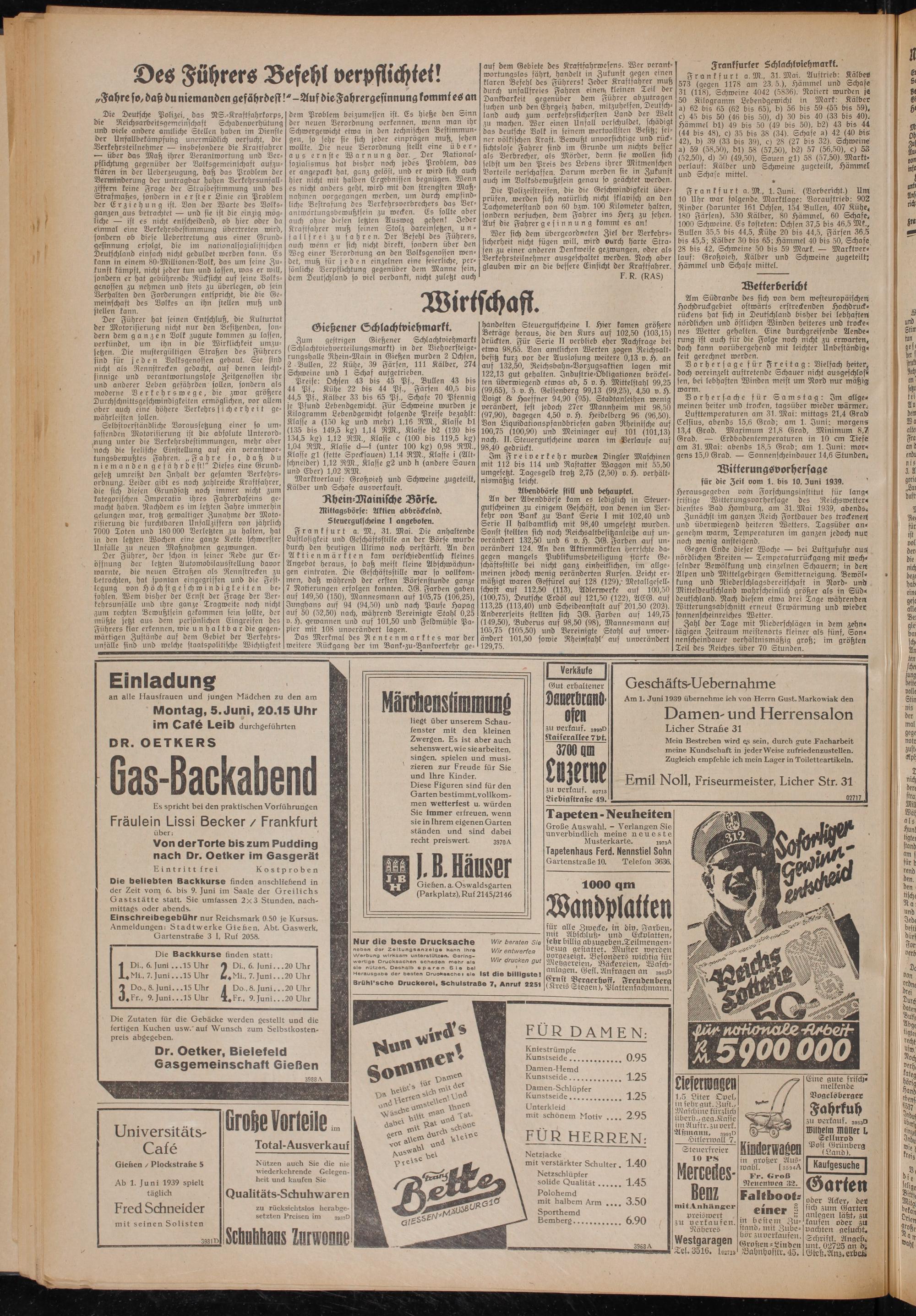 Zum gestrigen Gießener Schlachtviehmarkt (Schlachtviehverteilungsmarkt) in der Diehversteige- rungshalle Rhein-Main in Gießen wurden 2 Ochsen, 2 Bullen, 22 Kühe, 39 Färsen, 111 Kälber, 274 Schweine unb 1 Schaf aufgetrieben.