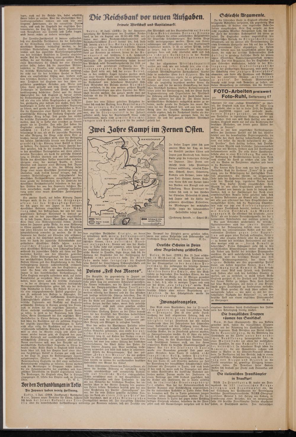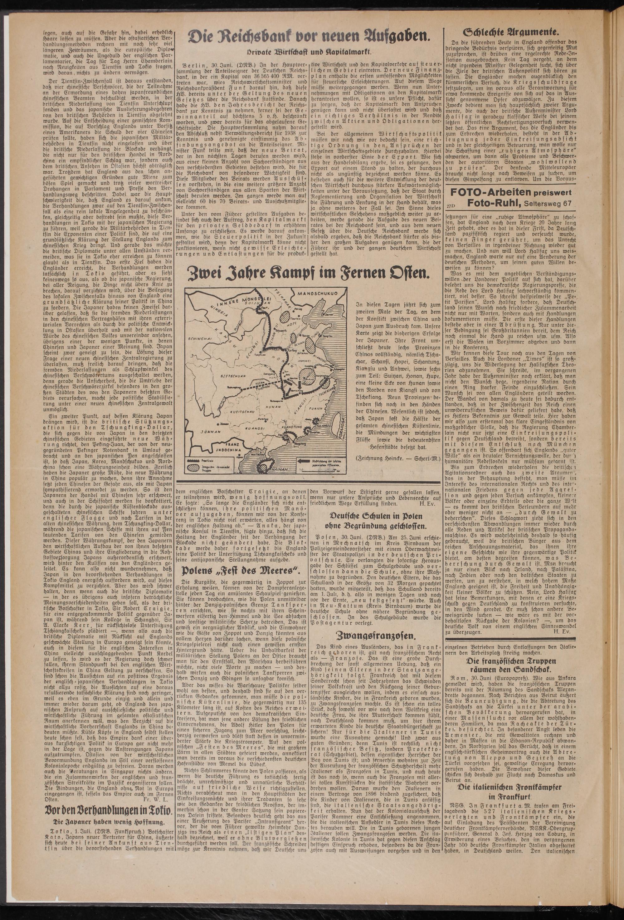 Der Tientsin-Zwischenfall ist daraus entstanden, daß vier chinesische Verschwörer, die der Teilnahme an der Ermordung eines hohen japanfreundlichen chinesischen Beamten beschuldigt werden, in der britischen Niederlassung von Tientsin Unterschlupf fanden und das japanische Auslieferungsbegehren von den britischen Behörden in Tientsin adgelehnt wurde. Auf die Entscheidung einer gemischten Kommission, die auf Vorschlag Englands unter Vorsitz eines Amerikaners die Schuld der vier Chinesen prüfen sollte, haben sich die japanischen Militärbehörden in Tientsin nicht eingelassen und über die britische Niederlassung die Blockade verhängt, die nicht nur für den britischen Handel in Nordchina ein empfindlicher Schlag war, sondern auch dem britischen Ansehen in Ostasien höchst abträglich war. Trotzdem hat England aus den schon angeführten gewichtigen Gründen gute Miene zum bösen Spiel gemacht und trotz vieler wortreicher Drohungen in Parlament und Presse den Verhandlungsweg beschritten. Dabei war die Hauptschwierigkeit die, daß England es darauf ankam, die Verhandlungen zwar auf den Tientsin-Zwischenfall als eine rein lokale Angelegenheit zu beschränken, gleichzeitig aber bestrebt sein mußte, diese Verhandlungen in Tokio mit der japanischen Regierung zu führen, weil gerade die Militärbehörden in Tientsin die Exponenten einer Politik sind, die auf eine grundsätzliche Klärung der Stellung Englands zum chinesischen Krieg bringt. Und gerade das möchte die britische Diplomatie unter allen Umständen vermeiden, was sie in Tokio eher erreichen zu können glaubt als in Tientsin. Das erste Ziel haben die Engländer erreicht, die Verhandlungen werden tatsächlich in Tokio geführt, aber es sieht keineswegs so aus, als ob die japanische Regierung, bei aller Neigung, die Dinge nicht übers Knie zu brechen, darauf verzichten wird, über die Beilegung des lokalen Zwischenfalls hinaus von England eine grundsätzliche Klärung seiner Politik in China zu fordern. Die Japaner haben keinen Zweifel darüber gelassen, daß sie die fremden Niederlassungen in den chinesischen Vertragshäfen mit ihren exterritorialen Vorrechten als durch die politische Entwicklung in Ostasien überholt und mit der nationalen Wurde des chinesischen Volkes unvereinbar ansehen, übrigens einer der wenigen Punkte, in denen Chinesen und Japaner einer Meinung sind. Japan scheint zwar geneigt zu sein, die Lösung dieser Frage einer neuen chinesischen Zentralregierung zu überlassen, muß freilich darauf bringen, daß die fremden Niederlassungen als Schlupfwinkel des chinesischen Derschwörertums ausgeschaltet werden, denn gerade die Unsicherheit, die die Umtriebe der chinesischen Verschwörerzirkel besonders in den großen Städten des von den Japanern besetzten Gebiets verursachen, macht jede politische Stabilisierung unter einer neuen chinesischen Zentralgewalt unmöglich.