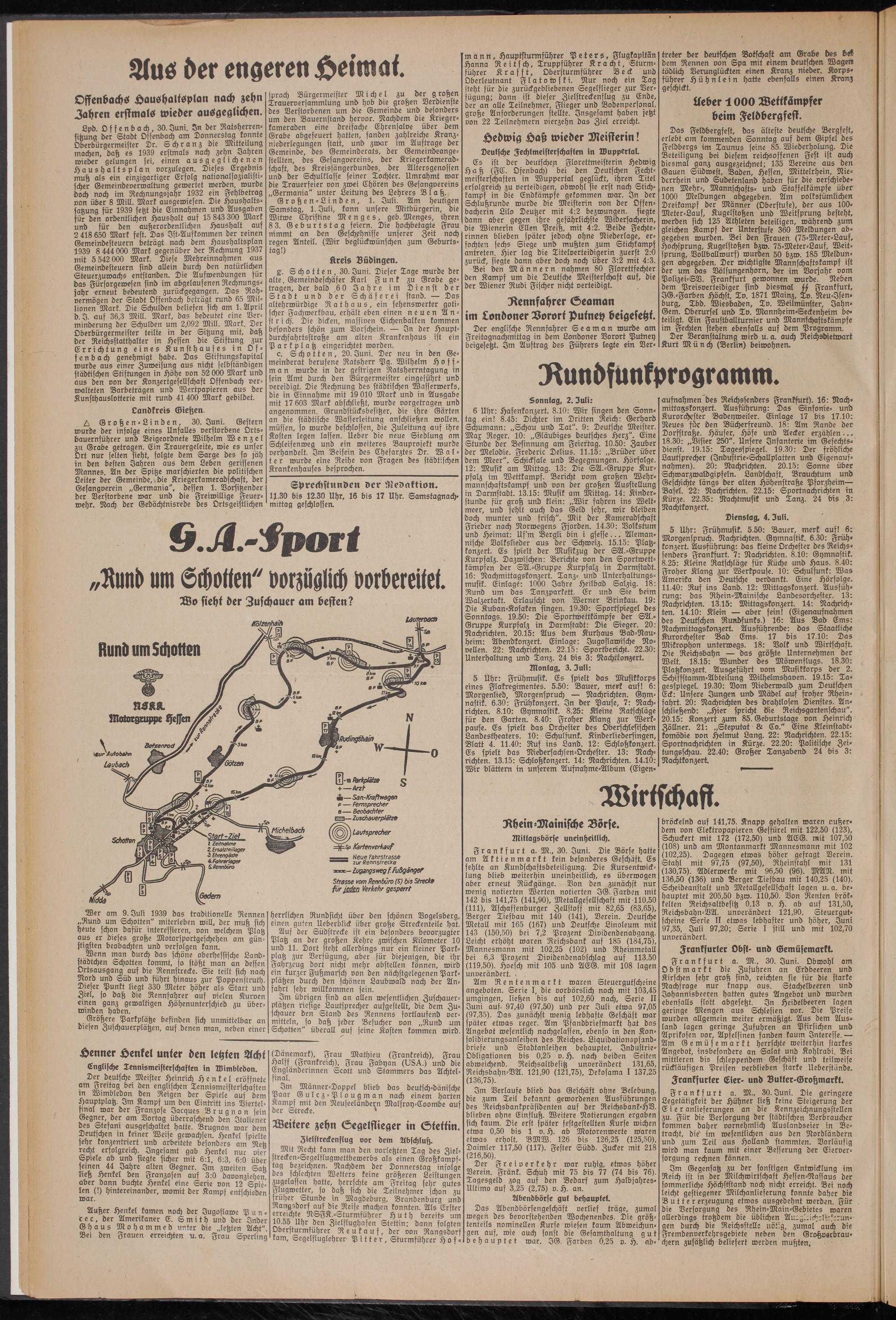 Wer am 9. Juli 1939 das traditionelle Rennen „Rund um Schotten" miterleben will, der muß sich heute schon dafür interessieren, von welchem Platz aus er dieses große Motorsportgeschehen am günstigsten beobachten und verfolgen kann.