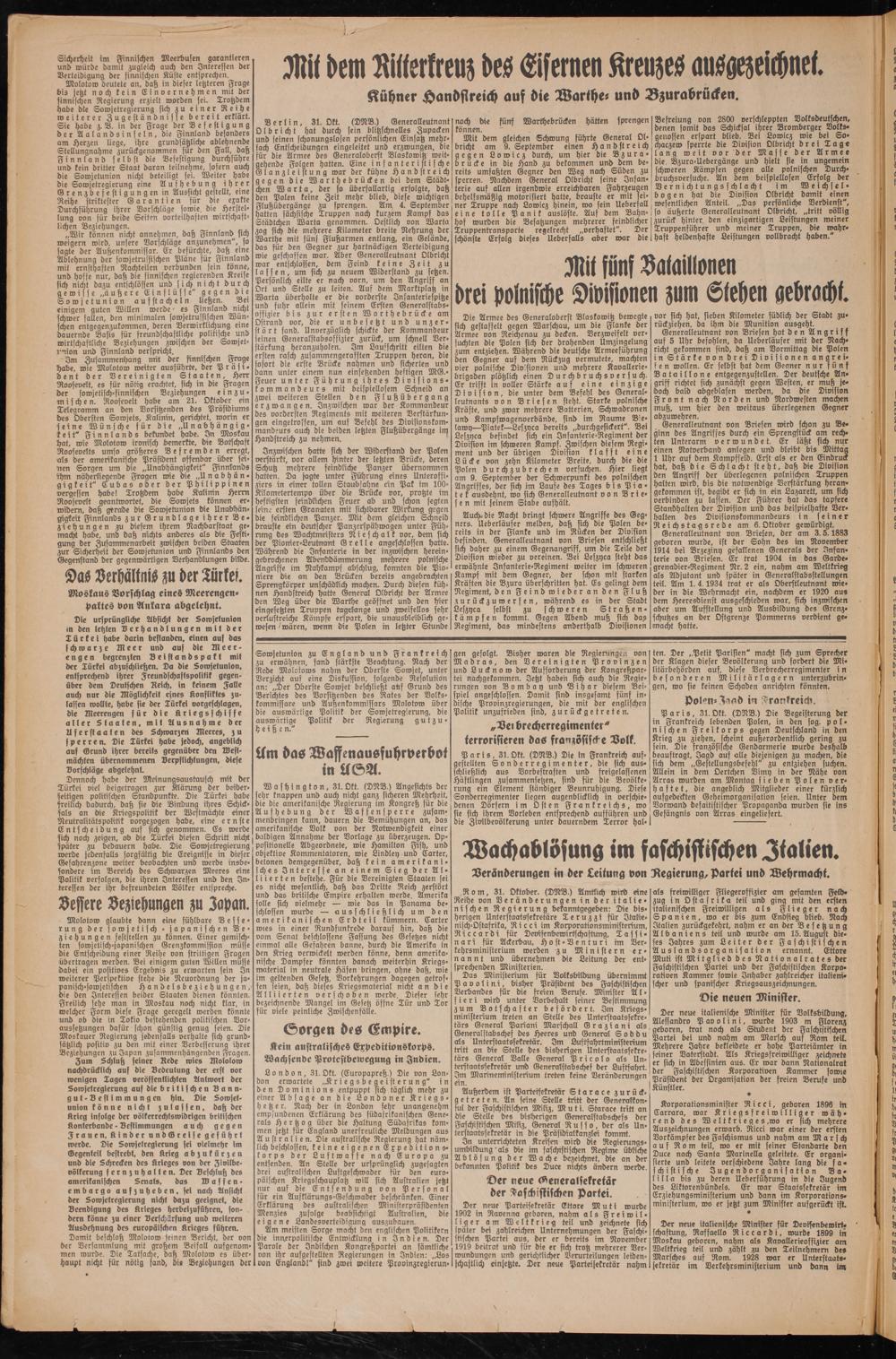 als freiwilliger Fliegerofsizier am gesamten Feld- Zug in Ostafrika teil und ging mit den ersten italienischen Freiwilligen als Flieger nach Spanien, wo er bis zum Endsieg blieb. Nach Italien zurückgekehrt, nahm er an der Besetzung Albaniens teil und wurde am 15. August dieses Jahres zum Leiter der Faschistischen Auslandsorganisation ernannt. Ettore Mutt ist Mitglied des Nationalrates der Fafchisttschen Partei und der Faschisttschen Korpo- rahnen Kammer sowie Inhaber zahlreicher italienischer und spanischer Kriegsauszeichnungen.