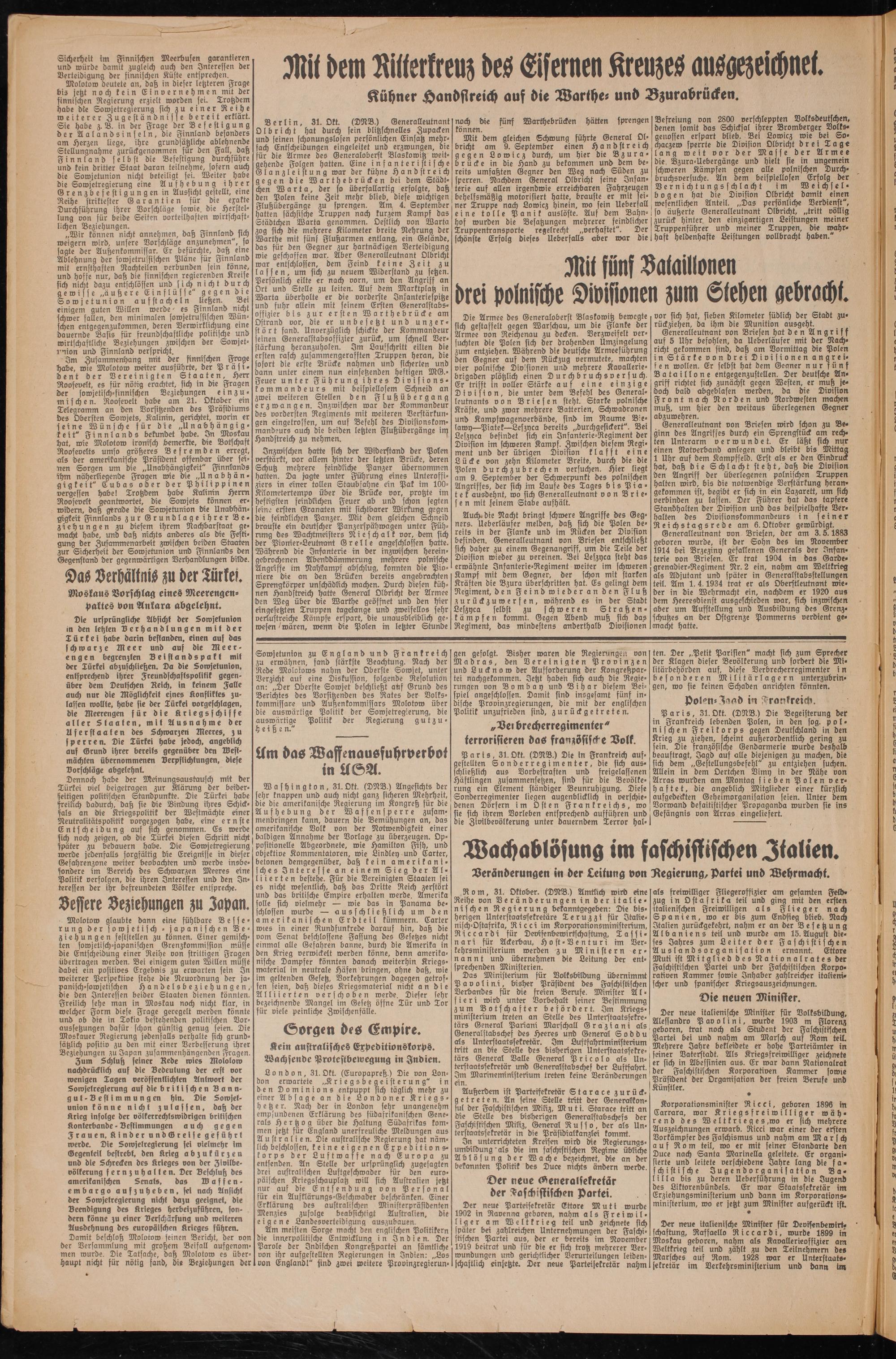 Generalleutnant von Briesen wird schon zu Beginn des Angriffes durch ein Sprengstück am rechten Unterarm verwundet. Er läßt sich nur einen Notverband anlegen und bleibt bis Mittag 1 Uhr auf dem Kampffeld. Erst als er den Eindruck hat, daß die Schlacht steht, daß die Division den Angriff der überlegenen polnischen Truppen halten wird, bis die notwendige Verstärkung heran- gekommen ist, begibt er sich in ein Lazarett, um sich verbinden zu lassen. Der Führer hat das tapfere Standhalten der Division und das beispielhafte Verhalten des Divisionskommandeurs in seiner Reichstagsrede am 6. Oktober gewürdigt.