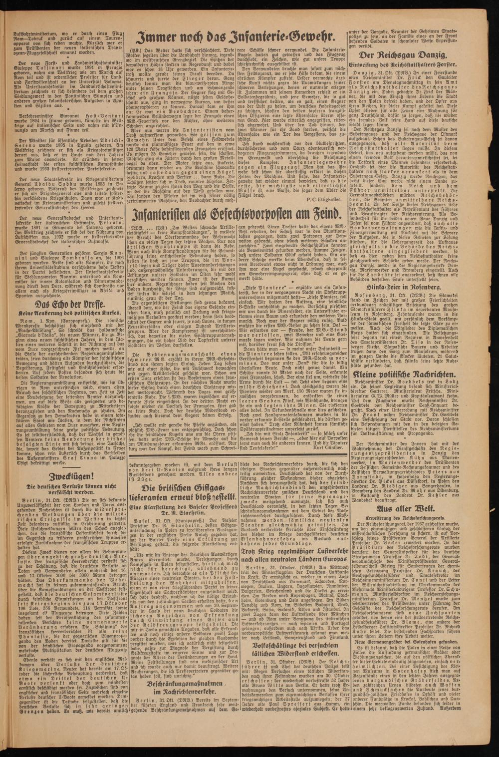 Diesem Zweck dienen vor allem die Behauptun- Fen über angeblich große deutsche Ver- uste. Der französische Heeresbericht versteift sich zu der Schätzung, daß die deutschen Verluste an Toten und Verwundeten allein während des In. und 17. Oktober 2000 bis 3000 Mann betragen hätten. Das Oberkommando der Wehrmacht hat in feinem zusammenfassenden Bericht über die Kampfhandlungen an der Westfront festgestellt, daß die deutschenGesamtverluste durch kindliche Einwirkungen an der Westfront seit Krieasbeginn bis zum 17. Oktober 196 Tote, 356 Verwundete, 114 Vermißte sowie insgesamt elf Flugzeuge betrugen. Diese Zahlen haben seit der Veröffentlichung des zusammen- fassenden Berichtes keine nennenswerte Veränderung erfahren. Die , Schätzung" Oes französischen Heeresberichtes ist also reine Phantasie, die der gegnerischen Lügenpropa- ganba den Boden bereitet. Dasselbe gilt für die von der feindlichen Propaganda vorgenommene mehrfache Multtplikatton der deutschen Flugzeug-
