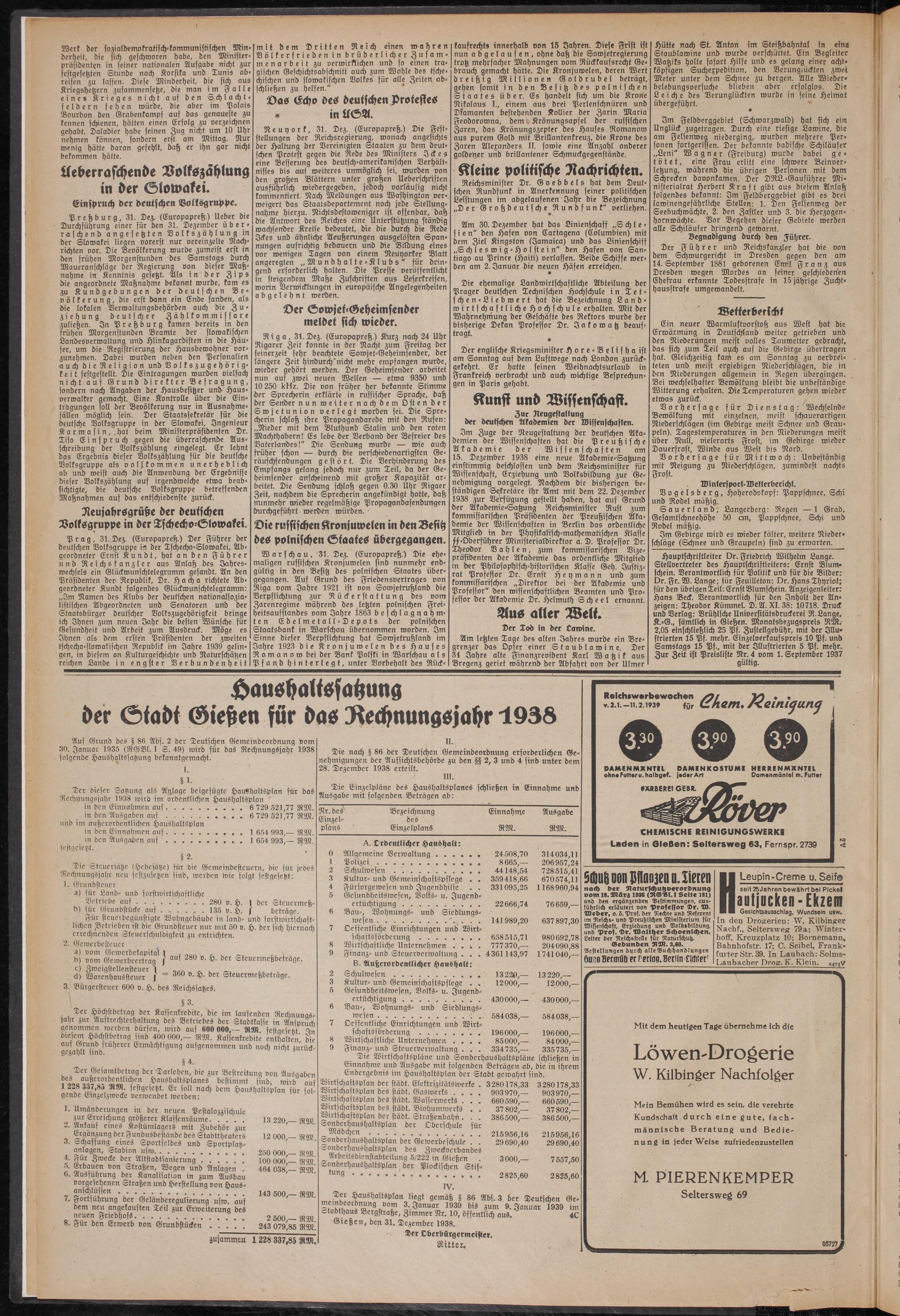 Hauptschriftleiter Dr. Friedrich Wilhelm Lange. Stellvertreter des Hauptschriftleiters: Ernst Blum- schein. Verantwortlich für Politik und für die Bilder: Dr. Fr. W. Lange; für Feuilleton: Dr. Hans Thyriot; für den übrigen Teil: Ernst Blumschein. Anzeigenleiter: Hans Beck. Verantwortlich für den Inhalt der Anzeigen: Theodor Kümmel. D. A. XI. 38: 10718. Druck und Verlag: Brühlsche Universitätsdruckerei R. Lange, K.-G., sämtlich in Gießen. Monatsbezugspreis RM. 2,05 einschließlich 25 Pf. Zustellgebühr, mit der Illustrierten 15 Pf. mehr. Einzelverkaufspreis 10 Pf. und Samstags 15 Pf., mit der Illustrierten 5 Pf. mehr. Zur Zett ist Preisliste Nr. 4 vom 1. September 1937 gültig.