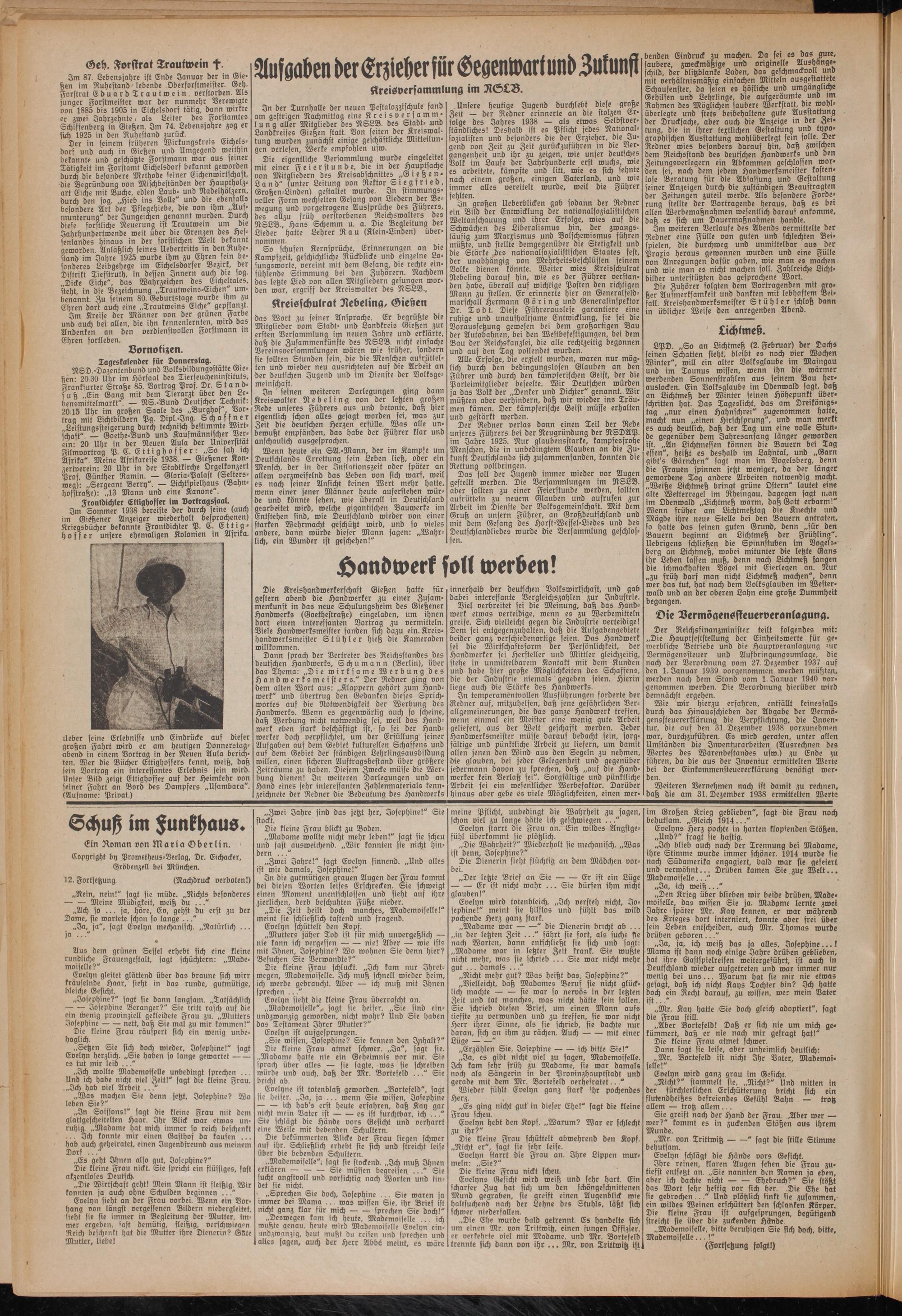 Im Sommer 1938 bereiste der durch seine (auch im Gießener Anzeiger wiederholt besprochenen) Kriegsbücher bekannte Frontdichter P. C. Ettighoffer unsere ehemaligen Kolonien in Afrika.