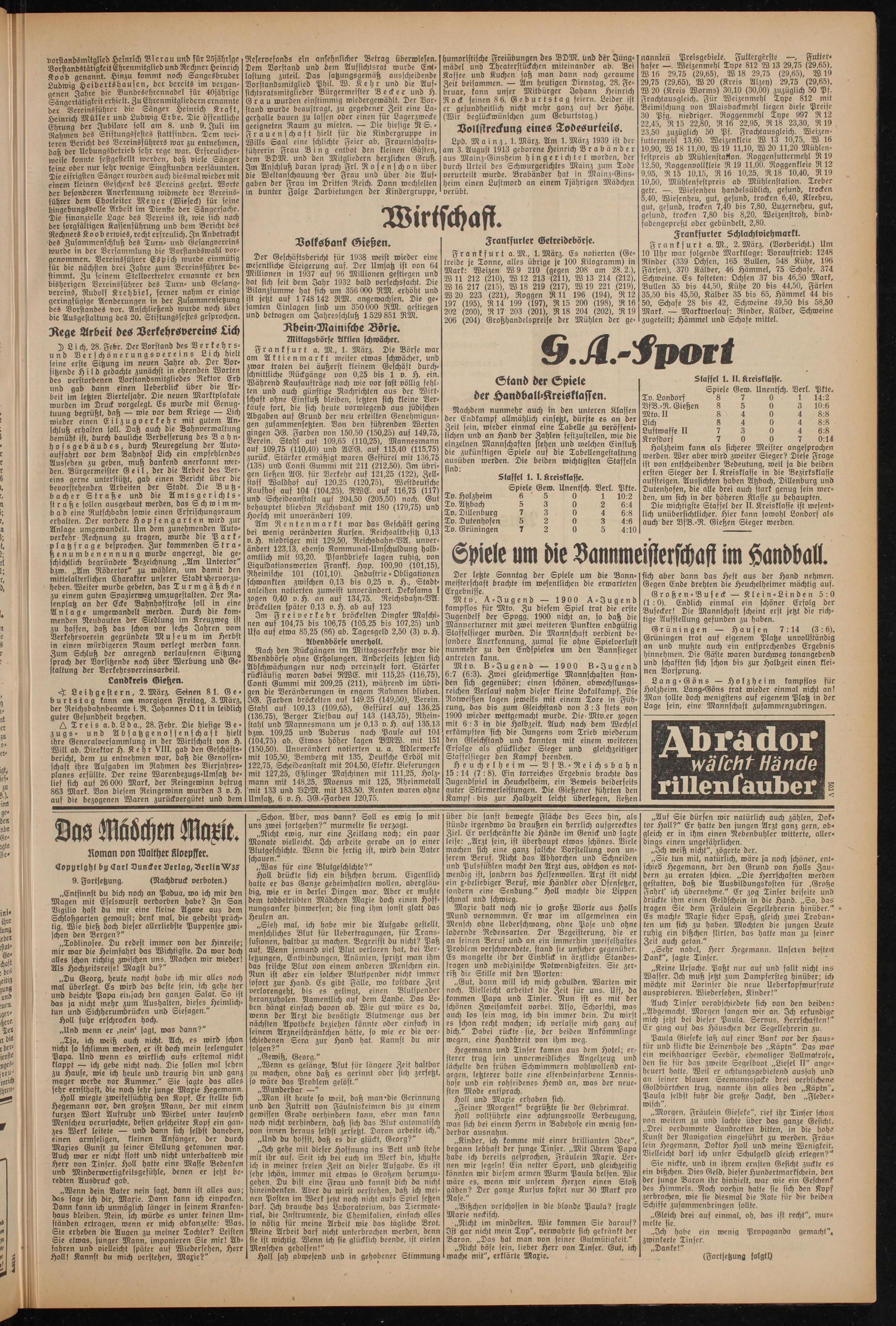 A Treis a.d. Ld a., 28. Febr. Die hiesige Bezugs- und Absatzgenossenschaft hielt ihre Generalversammlung in der Wirtschaft von H. Will ab. Direktor H. Kehr VIII. gab den Geschäftsbericht, dem zu entnehmen war, daß die Genossenschaft ihre Aufgaben im Rahmen des Vierjahresplanes erfüllte. Der reine Warenbezugs-Umsatz belief sich auf 26 000 Mark, der Reingewinn betrug 863 Mark. Von diesem Reingewinn wurden 3 v. H. auf die bezogenen Waren zurückoergütet und dem