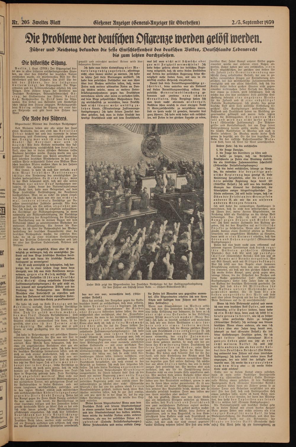 Seit Monaten leiden wir alle unter der Oual eines Problems, das uns einst das Versailler Diktat beschert hat und das nunmehr in seiner Ausartung und Entartung unerträglich geworden war. Danzig war umb ist eine deutsche Stadt! Der Korridor war und ist deutsch! Alle diese Gebiete verdanken ihre kulturelle Erschließung ausschließlich dem deutschen Volk, ohne das in diesen östlichen Gebieten tiefste Barbarei herrschen würde. Danzig wurde von uns getrennt! Der Korridor von Polen annektiert! Die dort lebenden deutschen Minderheiten in der qualvollsten Weise mißhandell! Heber eine Million Menschen deutschen Blutes mußten schon in den Jahren 1919/1920 ihre Heimat verlassen!