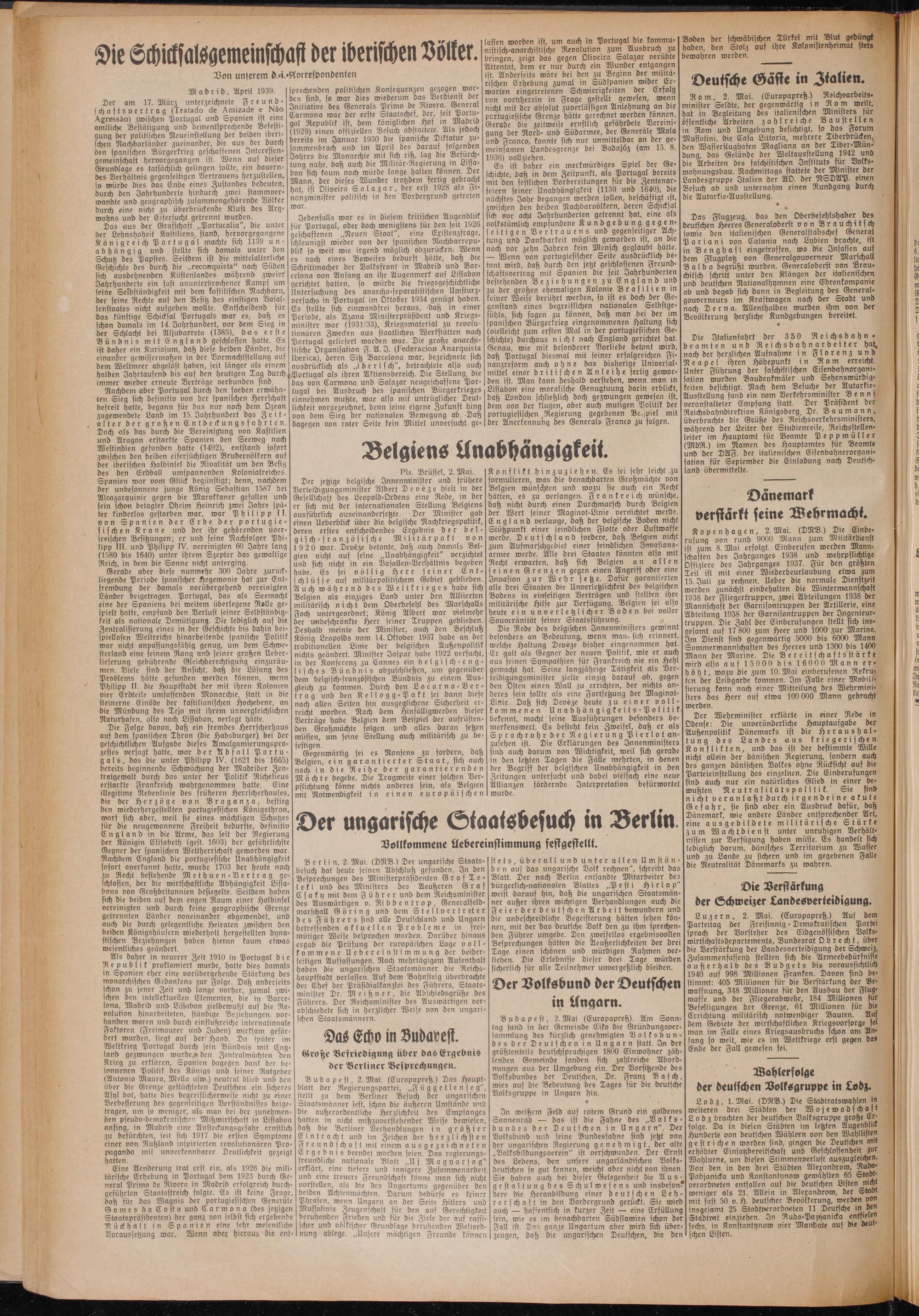 Es ist daher ein merkwürdiges Spiel der Geschichte, daß in dem Zeitpunkt, als Portugal bereits mit den festlichen Vorbereitungen für die Zentenarfeiern seiner Unabhängigkeit (1139 und 1640), die nächstes Jahr begangen werden sollen, beschäftigt ist, zwischen den beiden Nachbarvölkern, deren Schicksal sich vor acht Jahrhunderten getrennt hat, eine als volkstümlich empfundene Kundgebung gegenseitigen Vertrauens und gegenseitiger Achtung und Dankbarkeit möglich geworden ist, an die noch vor zehn Jahren kein Mensch geglaubt hätte. — Wenn von portugiesischer Seite ausdrücklich betont wird, daß durch den jetzt geschlossenen Freundschaftsvertrag mit Spanien die feit Jahrhunderten bestehenden Beziehungen zu England und zu der großen ehemaligen Kolonie Brasilien in keiner Weise berührt werden, so ist es doch der Gegenstand eines begreiflichen nationalen Selbstgefühls, sich sagen zu können, daß man bei der im spanischen Bürgerkrieg eingenommenen Haltung sich (vielleicht zum ersten Mal in der portugiesischen Geschichte) durchaus nicht nach England gerichtet hat. Genau, wie mit besonderer Vorliebe betont wird, daß Portugal diesmal mit seiner erfolgreichen Finanzreform auch ohne das bisherige Universal- mittel einer britischen Anleihe fertig gewor-