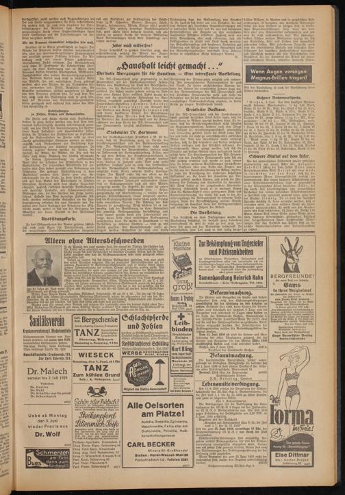 Die NS.-Frauenschaft zeigt gegenwärtig in der Gemeinschaft mit der Landesbauernschaft Hessen- Nassau eine Ausstellung im Saal des Gesellschafts- Vereins, die die Aufmerksamkeit aller Hausfrauen verdient. Die Schau wurde gestern mittag im Rahmen einer kleinen Feier eröffnet. Dabei wurde der Sinn und die grundsätzliche Bedeutung der Ausstellung eingehend gewürdigt. Zunächst spielte der Frauenschafts-Spielkreis (Zimmer, Schüttler, Cäsar und Treppinger) ein Konzert für vier Violinen von Georg Philipp Telemann und fand damit dankbaren Beifall. Die Kreisfrauenschaftsleiterin Frau W r e d e hieß den Kreisleiter, die Vertreter der Landesbauerschaft und die Kameradinnen aus dem Kreise der NS.-Frauenschaft und des Frauenwerks herzlich willkommen. Sodann sprach