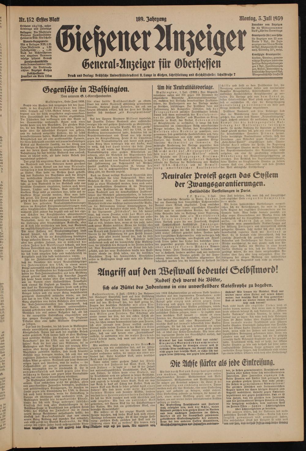 Erscheint täglich, außer Sonntags und Feiertags Beilagen: Die Illustrierte Gießener Famllienblätter Heimat im Bild • Die Scholle
