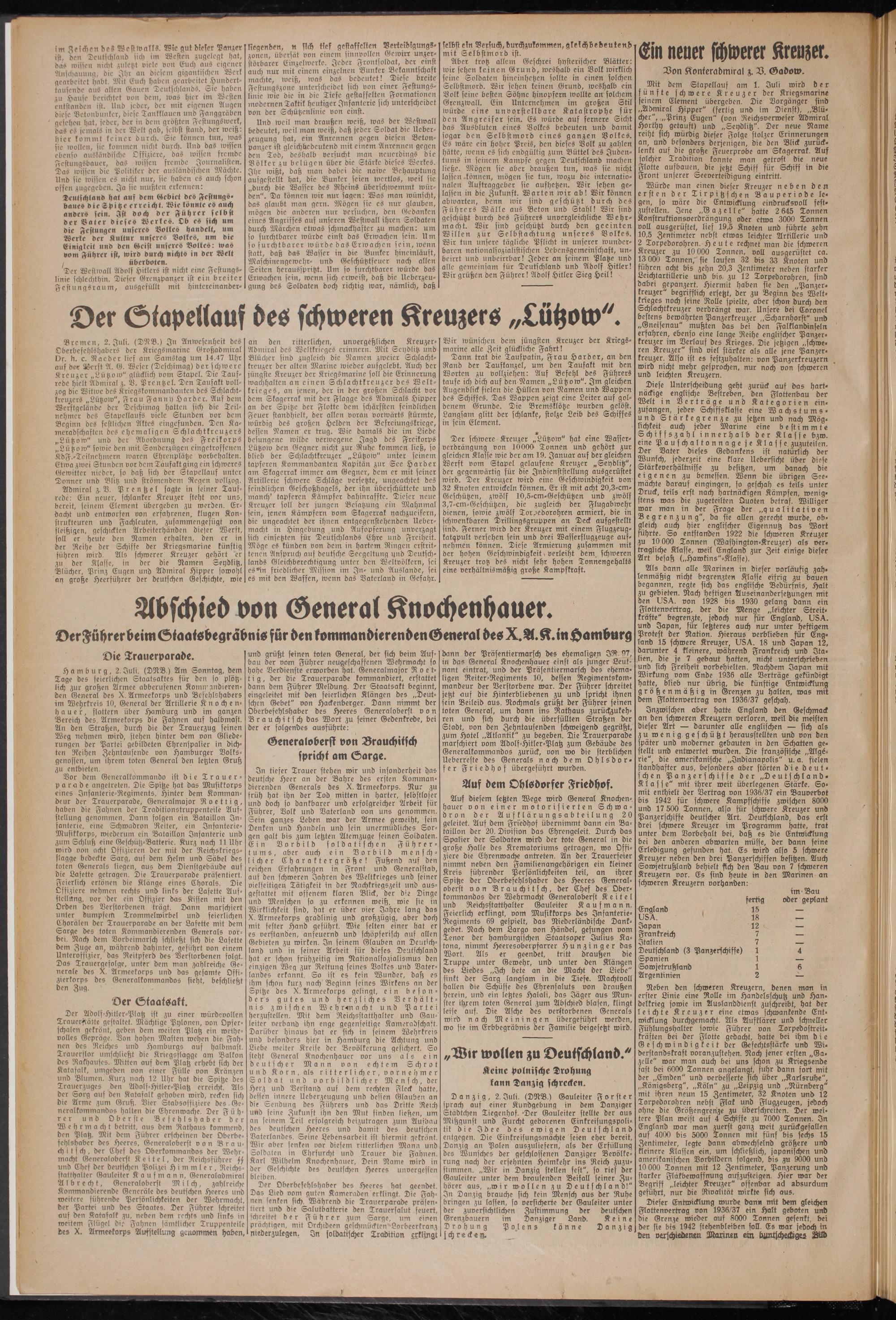 Mit dem Stapellauf am 1. Juli wirb der fünfte schwere Kreuzer der Kriegsmarine seinem Element übergeben. Die Vorgänger sind „Admiral Hipper" (fertig und im Dienst), „Blücher", „Prinz Eugen" (von Reichsverweser Admiral Horthy getauft) unb „Seydlitz". Der neue Name reiht sich würdig dieser Folge stolzer Erinnerungen an, und besonders derjenigen, die den Blick zurücklenkt auf bie große Feuerprobe am Skagerrak. Aus solcher Tradition konnte man getrost die neue Flotte aufbauen, die jetzt Schiff für Schiff in die Front unserer Seeverteibigung eintritt.