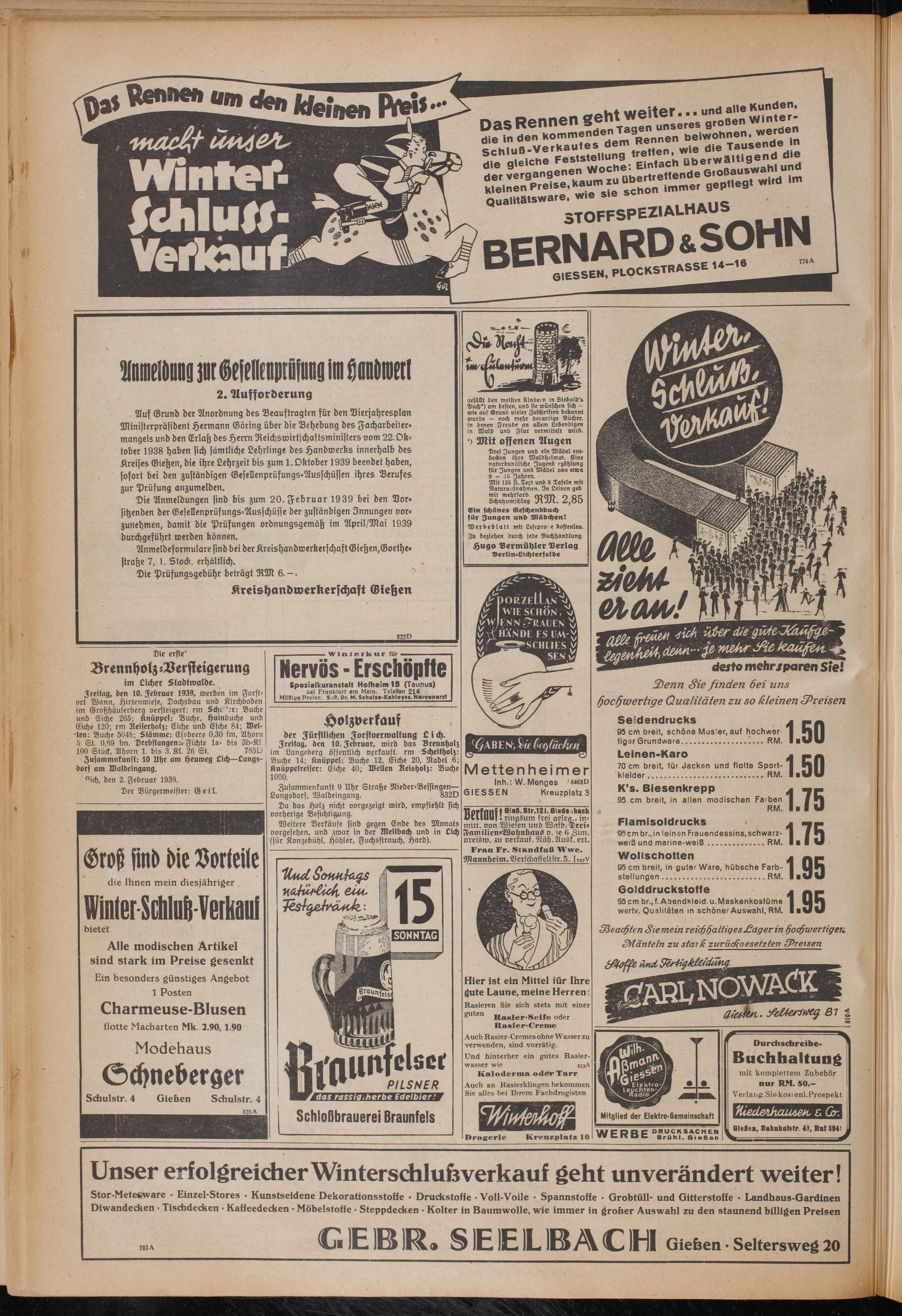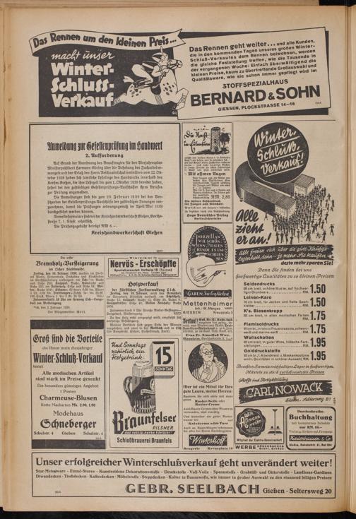 Auf Grund der Anordnung des Beauftragten für den Dierjahresplan Ministerpräsident Hermann Göring über die Behebung des Facharbeitermangels und den Erlaß des Herrn Reichswirtschaftsministers vom 22. Oktober 1938 haben sich sämtliche Lehrlinge des Handwerks innerhalb des Kreises Gießen, die ihre Lehrzeit bis zum 1. Oktober 1939 beendet haben, sofort bei den zuständigen Gesellenprüsungs-Ausschüssen ihres Berufes zur Prüfung anzumelden.