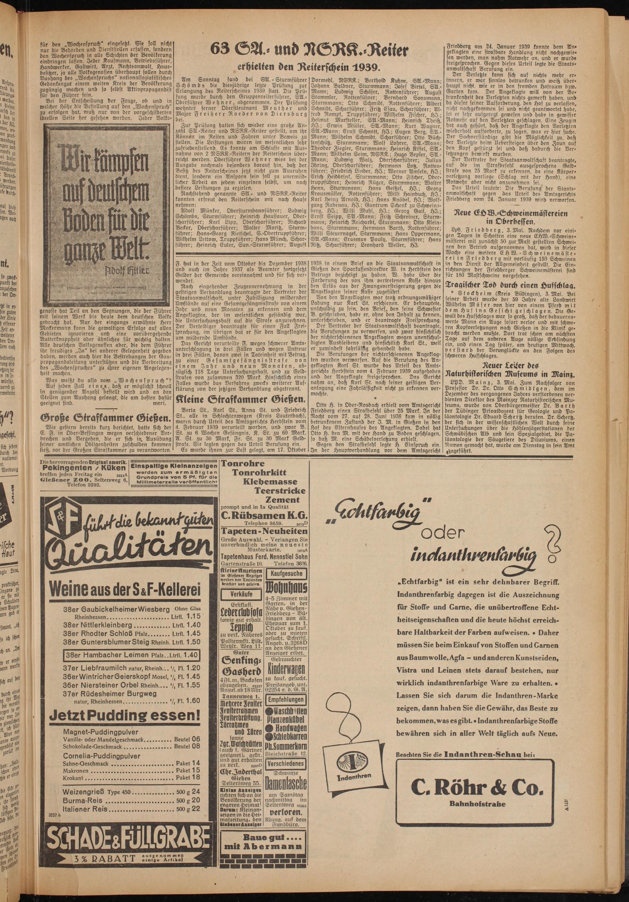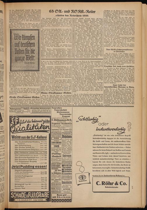 Am Sonntag fand bei SA. - Sturmführer S ch ö m b s die diesjährige letzte Prüfung zur Erlangung das Reiterscheines 1939 statt. Die Prüfung wurde durch den Gruppenrsiterführer, SA.- Oberführer Wehner, abgenommen. Der Prüfung wohnter ferner Oberstleutnant Meuther und Major Freiherr Roeder von Diersburg bei.