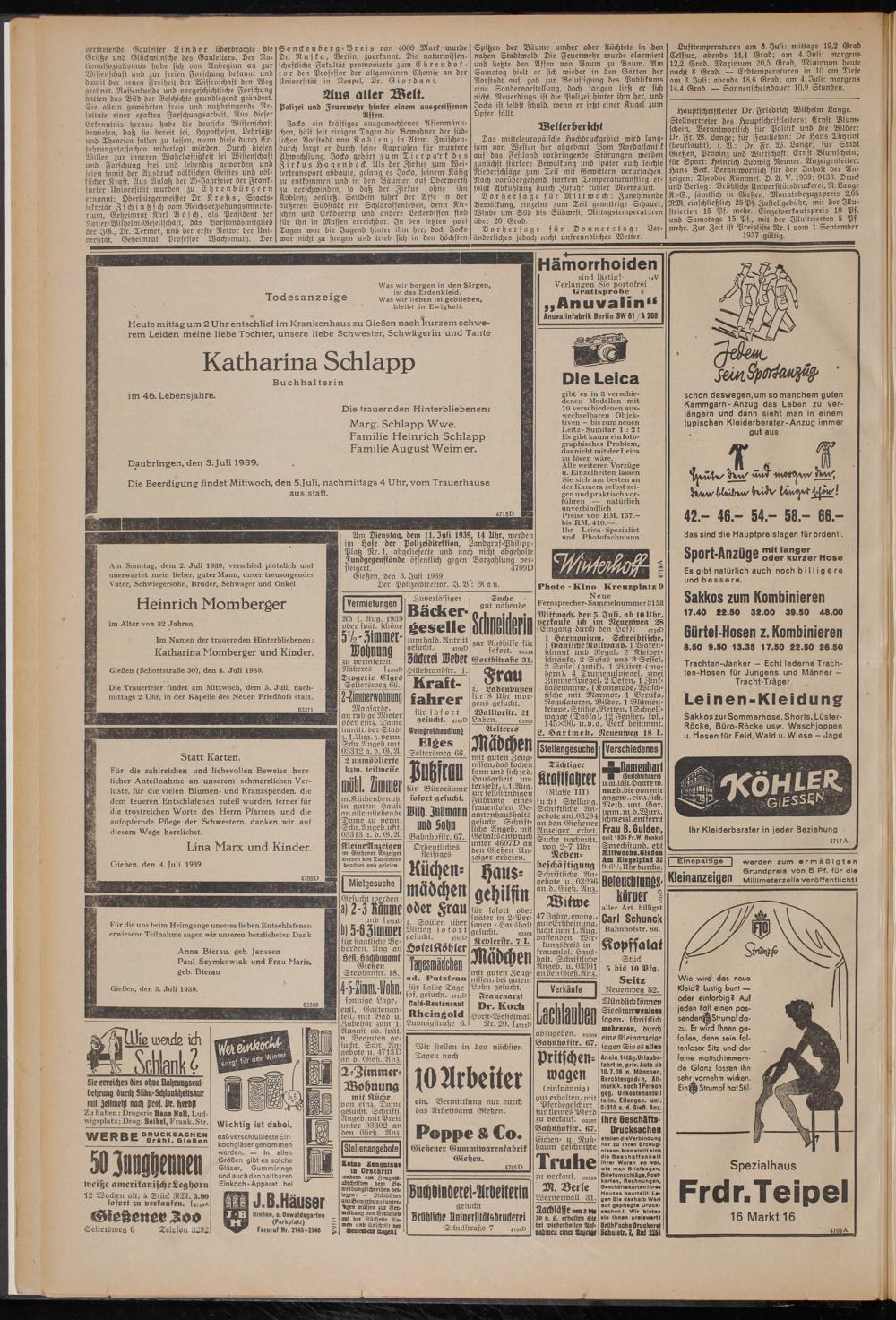Hauptschriftleiter Dr. Friedrich Wilhelm Lange. Stellvertreter des Hauptschriftleiters: Ernst Blum- schein.. Verantwortlich für Politik und die Bilder: Dr. Fr. W. Lange: für Feuilleton: Dr. Hans Thyriot (beurlaubt), i. V.: Dr. Fr. W. Lange: für Stadt Gießen, Provinz und Wirtschaft: Ernst Blumschein; für Sport: Heinrich Ludwig Neuner. Anzeigenleiter: Hans Beck. Verantwortlich für den Inhalt der Anzeigen: Theodor Kümmel. D. 21. V. 1939: 9133. Druck und Verlag: Brühlsche Universitätsdruckerei, R. Lange K.-G-, sämtlich in Gießen. Monatsbezugspreis 2,05 RM. einschließlich 25 Pf. Zustellgebühr, mit der Illustrierten 15 Pf. mehr. Einzelverkausspreis 10 Pf. und Samstags 15 Pf., mit der Illustrierten 5 Pf. mehr. Zur Zeit ist Preisliste Nr.4 vom 1. September 1937 gültig.