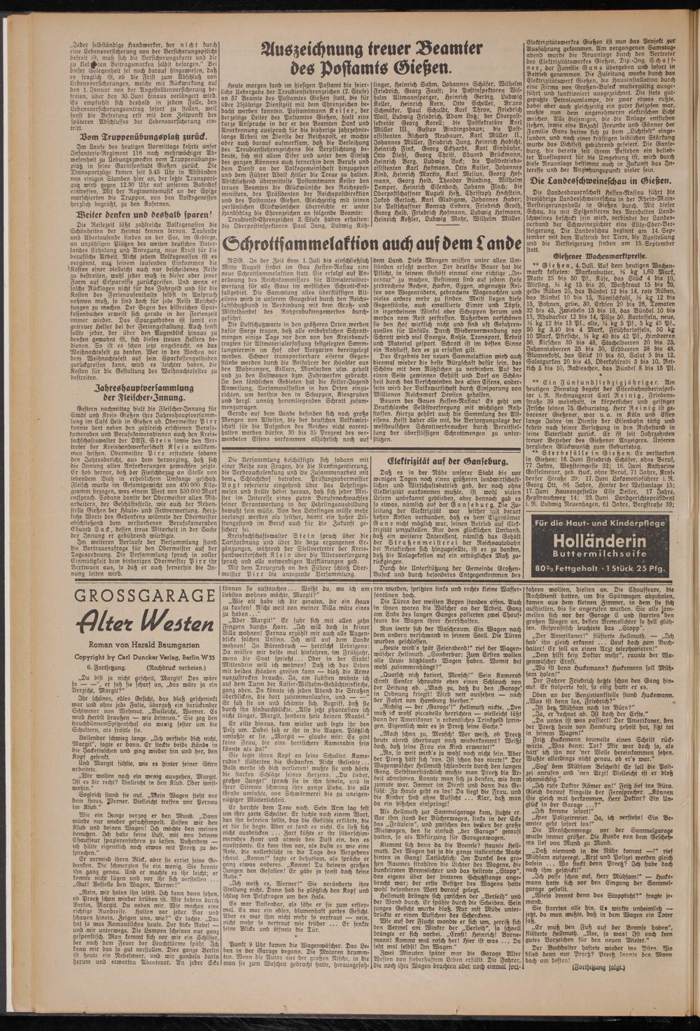 NSG. In der Zeit tiom 1. Juli bis einschließlich Mitte August findet im Gau Hessen-Nassau eine neue Schrottsammelaktion statt. Sie erfolgt auf Anordnung des Reichskommissars für Altmaterialverwertung für alle Gaue im westlichen Schrott-Entfallgebiet. Die Sammlung alles überflüssigen Alt- /eisens wird in unserem Gaugebiet durch den Reichs- luftschutzbund in Verbindung mit dem Groß» und Mittelhandel des Rohproduktengewerbes durchgeführt.