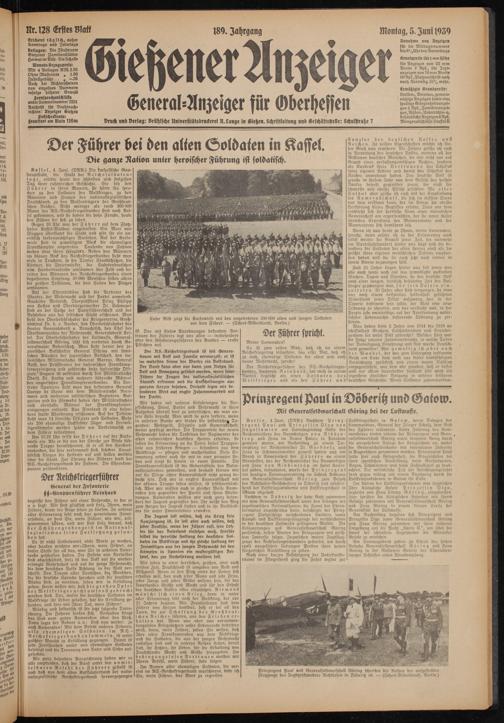 Erlchetnl täglich, außer Sonntags und Feiertags Beilagen: Die Illustrierte Gießener Familienblätter Heimat im Bild • Die Scholle Monatr-Vezugspreir: