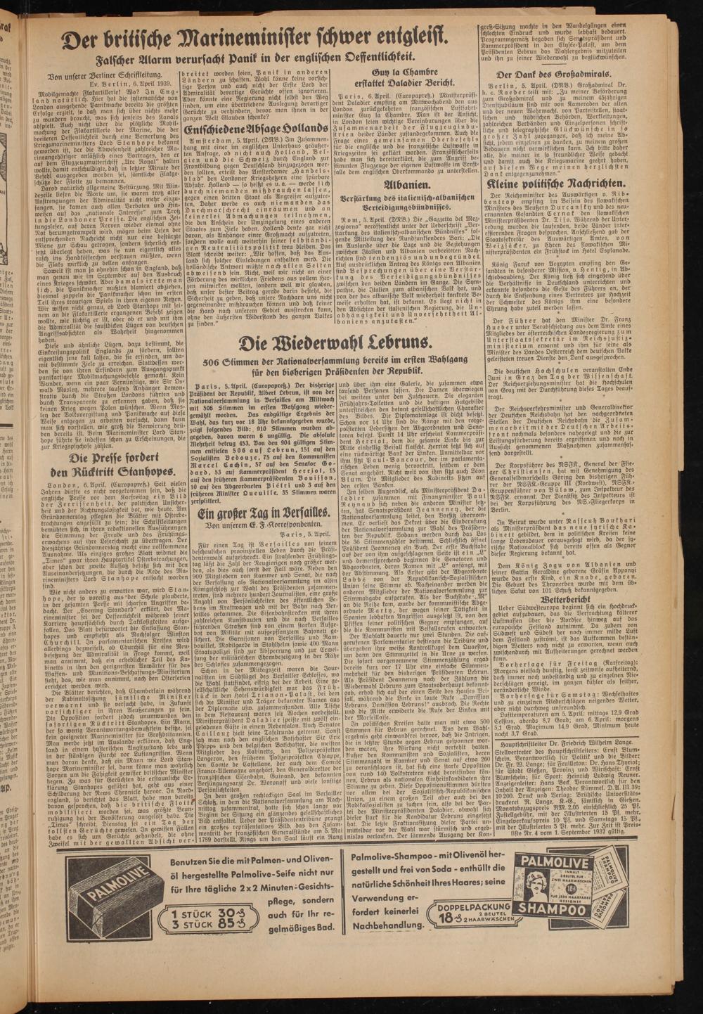 Paris. 5.April. (Europapreß.) Der bisherige Präsident der Republik. Albert Lebrun, ist von der Nationalversammlung in Versailles am Mittwoch mit 506 Stimmen im ersten Wahlgang wiedergewählt worden. Das endgültige Ergebnis der Wahl, das kurz vor 18 Uhr bekannlgegeben wurde, zeigt folgendes Bild:. 910 Stimmen wurden abgegeben, davon waren 6 ungültig. Die absolute Mehrheit betrug 453. Von den 904 gültigen Stimmen entfielen 506 auf Lebrun. 151 auf den Sozialisten Bedouze. 75 auf den Kommunisten Marcel Eachin, 57 auf den Senator <5o- dard. 53 auf Kammerpräsident Herr) ot, 15 auf den früheren Kammerpräsidenten Voulsson, 10 auf den Abgeordneten Pietri und 3 auf den früheren Minister Oueuille. 35 Stimmen waren zersplittert.