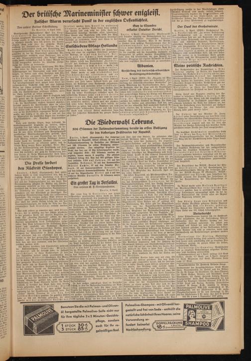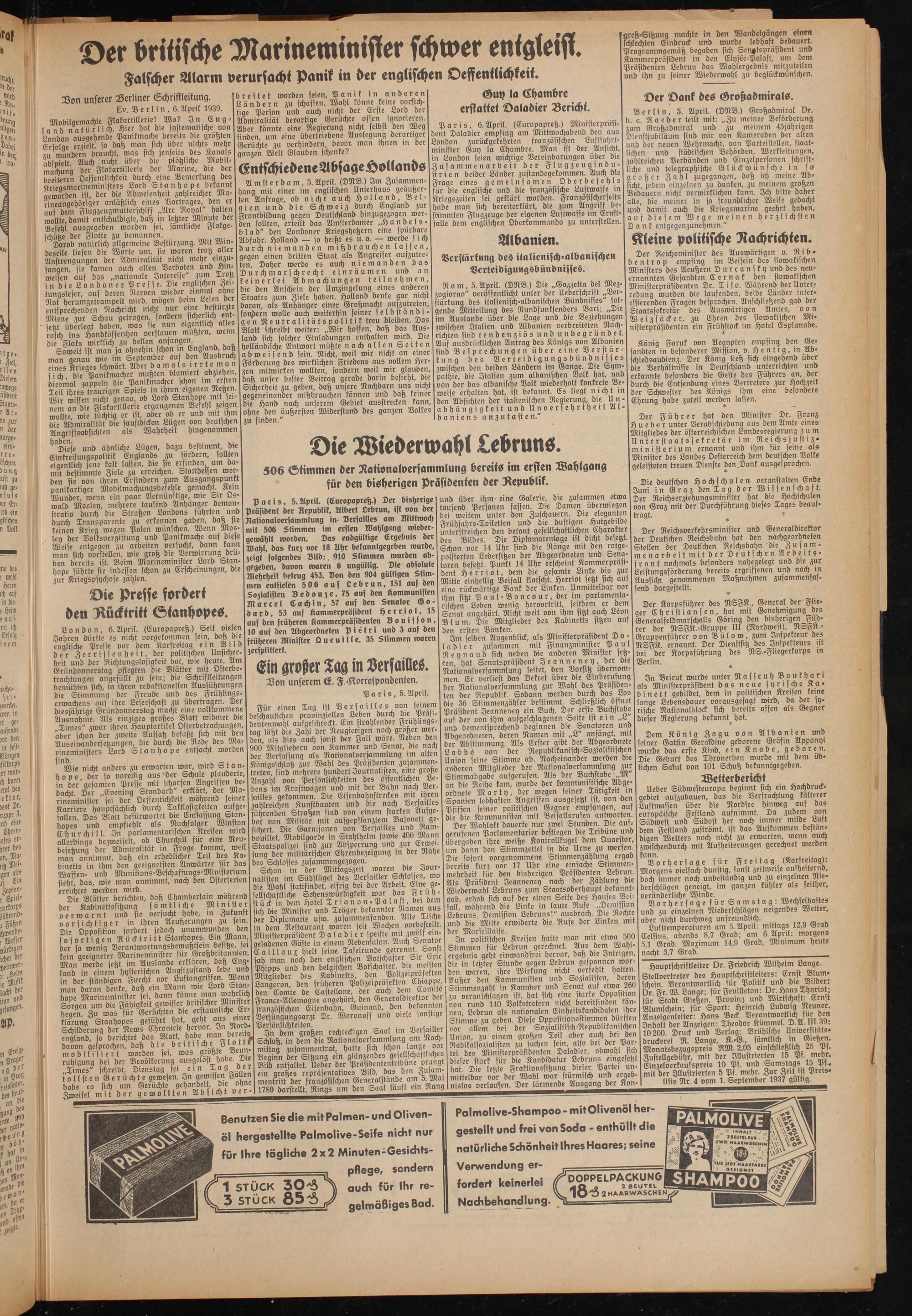 greß-Sitzung mochte in den Wandelgangen einen schlechten Eindruck und wurde lebhaft bedauert. Programmgemäß begaben sich SenHtspräsident und Kammerpräsident in den Elysee-Palast, um dem Präsidenten Lebrun das Wahlergebnis mitzuteilen und ihn zu seiner Wiederwahl zu beglückwünschen.