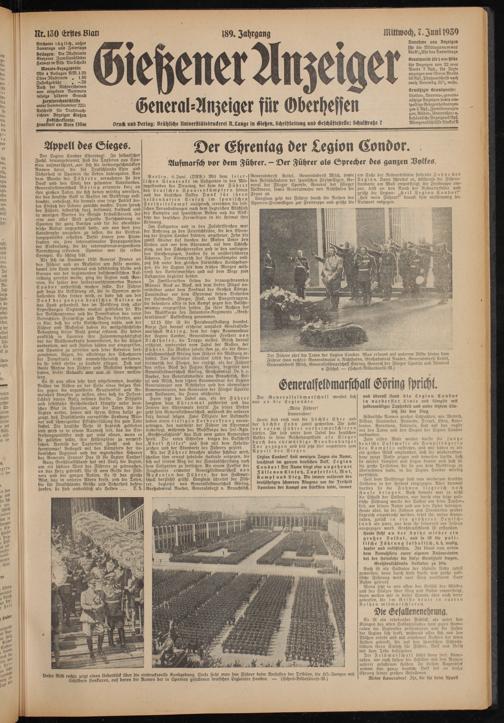 Es ist uns allen sehr hart angekommen, deutsche Brüder im Süden an der Seite eines stolzen Volkes gegen die organisierte Grausamkeit und Gemeinheit kämpfen zu wissen, ohne daß die Oeffent- lichkeit davon Notiz nehmen durfte. In Disziplin und selbstloser Bescheidenheit kämpfte unser deutsches Blut in Spanien, aber die Toten, die die Legion verlor, haben mit ihrem Leben dafür gezeugt, daß Deutschlands europäische Sendung Männer voll schweigender Pflichterfüllung bis zum Tode findet. Die deutsche Wehr ist siegreich geblieben und wird es in einem Ausmaß sein, das die Ein- kreisungspolitiker noch gar nicht ahnen, wenn es sie gelüsten sollte, ihre Höllenpläne zu verwirklichen. Vorbild der Tapferkeit, Zucht und des Heroismus! Besiegelt mit den Kämpfern der italienischen Legionen und der mannhaften Scharen des Generals Franco! Das ist die Legion Condor!