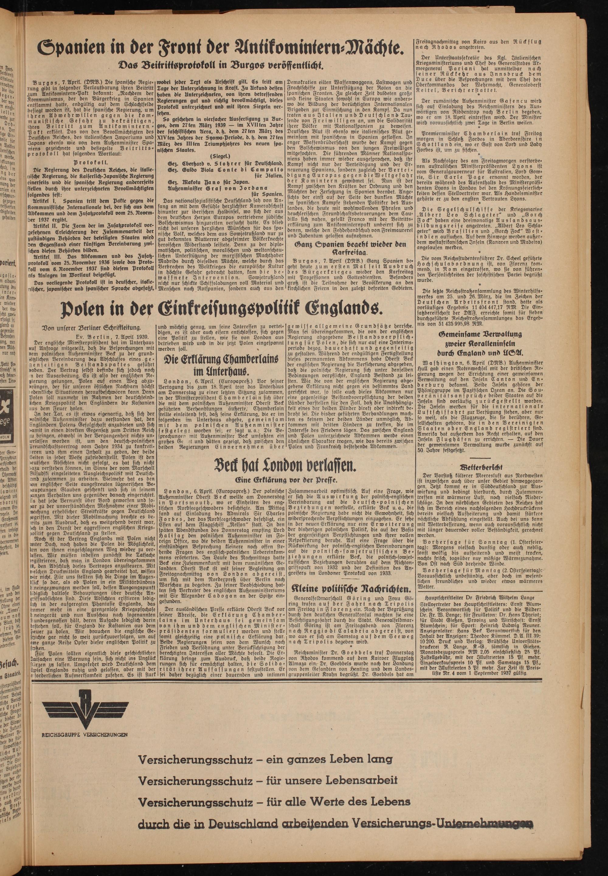 Hauptschriftleiter Dr Friedrich Wilhelm Lange Stellvertreter des Hauptschriftleiters: Ernst Blum- fchein. Verantwortlich für Politik und die Bilder: Dr. Fr. W. Lange; für Feuilleton: Dr. Hans Thyriot; für Stadt Gießen, Provinz und Wirtschaft: Ernst Blumschein; für Sport: Heinrich Ludwig Neuner. Anzeigenleiter.- Hans Beck Verantwortlich für den Inhalt der Anzeigen: Theodor Kümmel D.A. HI. 39: 10200. Druck und Verlag: Brühlsche Universitäts- druckerei R. Lange, K -G, sämtlich in Gießen. Monatsbezugspreis RM 2,05 einschließlich 25 Pf. Zustellgebühr, mit der Illustrierten 15 Pf mehr. Einzelverkaufspreis 10 Pf und Samstags 15 Pf., mit der Illustrierten 5 Pf mehr. Zur Zeit ist Preisliste Nr. 4 vom 1 September 1937 gültig