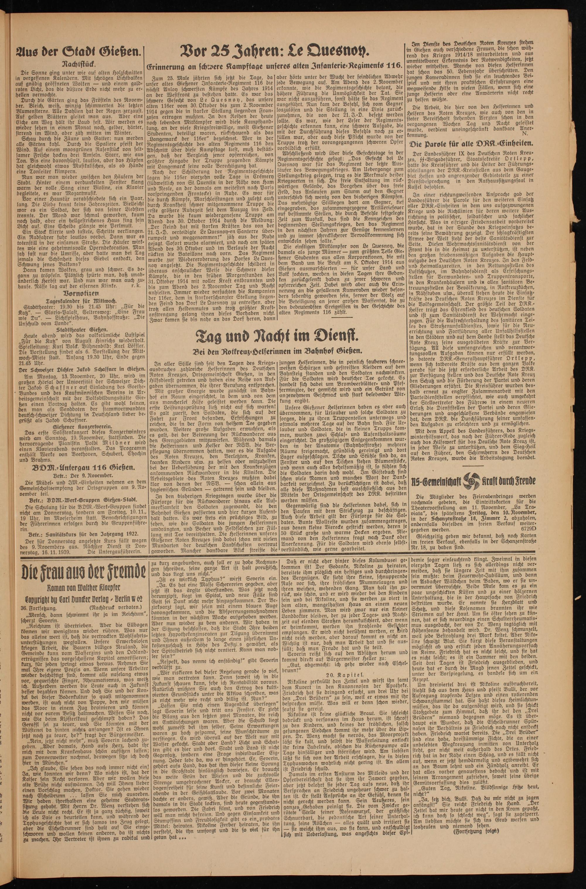 In aller Stille sind seit den Tagen des Kriegsausbruches zahlreiche Helferinnen des Deutschen Roten Kreuzes, Ortsgemeinschaft Gießen, in den Hilfsdienst getreten und haben eine Reihe von Aufgaben übernommen, die ihrer Berufung entsprechen.