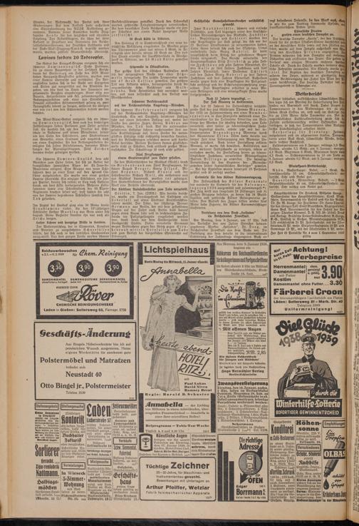 Hauptschriftleiter Dr. Friedrich Wilhelm Lange. Stellvertreter des Hauptschriftleiters: Ernst Blum« schein. Verantwortlich für Politik und für die Bilden Dr. Fr. W. Lange; für Feuilleton: Dr. Hans Thyriot; für den übrigen Teil: Ernst Blumschein. Anzeigenleiter: Hans Beck. Verantwortlich für den Inhalt der Anzeigen: Theodor Kümmel. D. A. XII. 38: 10843. Druck und Verlag: Brühlsche Universitätsdruckerei R.Lange, K.-G., sämtlich in Gießen. Monatsbezugspreis RM.- 2,05 einschließlich 25 Pf. Zustellgebühr, mit der Illu« ftrierten-15 Pf. mehr. Einzeloerkaufspreis 10 Pf. und Samstags 15 Pf., mit der Illustrierten 5 Pf. mehr. Zur Zeit ist Preisliste Nr. 4 vom 1. September 1937 gültig.