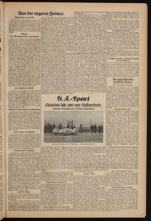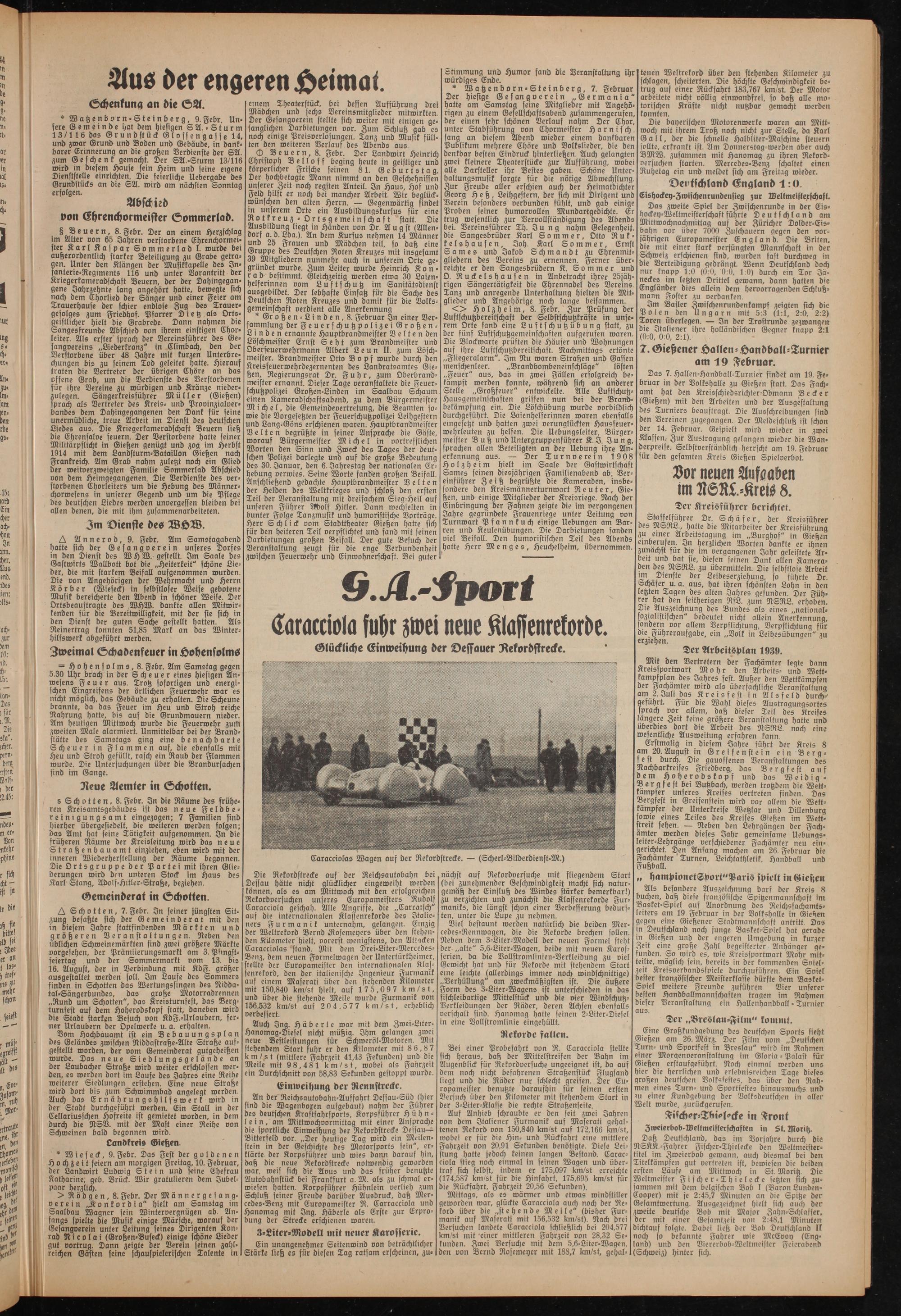 Mittags, als es wärmer und etwas windstiller geworden war, glückte Caracciola auch noch der Rekord über die „st ehende Meile" (bisher Furmanik auf Maserati mit 156,532 km/st). Nach drei Versuchen landete Caracciola schließlich bei 204,577 km/st mit einer mittleren Fahrzeit von 28,32 Sekunden. Zwei Versuche mit dem 5,6-Liter-Wagen, den von Bernd Rosemeyer mit 188,7 km/st, gchal-