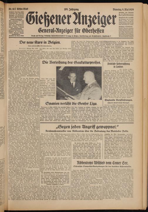 Erscheint täglich, außer Sonntags und Feiertags Beilagen: Die Illustrierte Gießener Familienblätter Heimat im Bild - Die Scholle