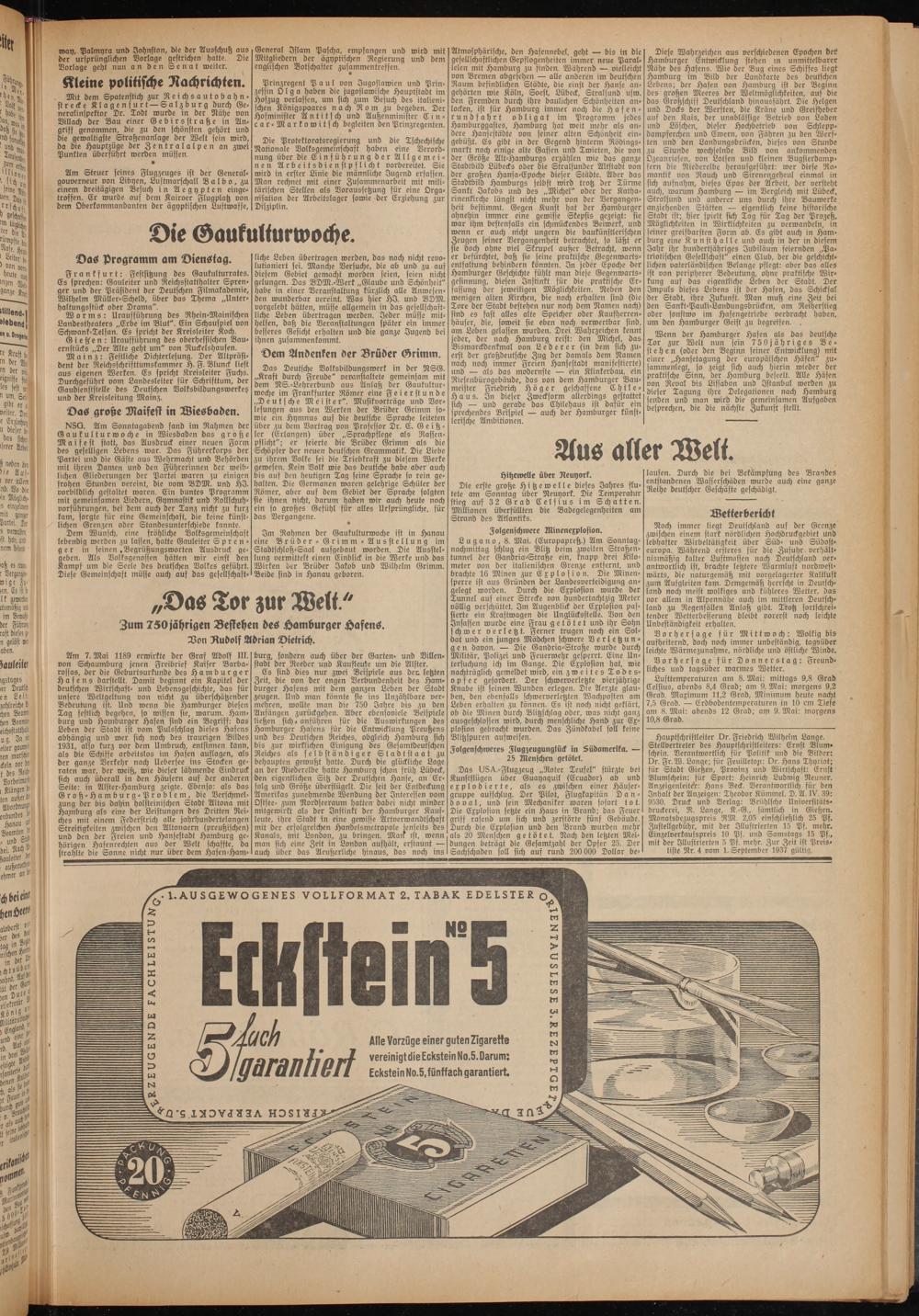 Am 7. Mai 1189 erwirkte der Graf Adolf III. von Schaumburg jenen Freibrief Kaiser Barbarossas, der die Geburtsurkunde des Hamburger Hafens darstellt. Damit beginnt ein Kapitel der deutschen Wirtschaft- und Lebensgeschichte, das für unsere Weltgeltung von nicht zu überschätzender Bedeutung ist. Und wenn die Hamburger diesen Tag festlich begehen, so wissen sie, warum. Hamburg und Hamburger Hafen sind ein Begriff: das Leben der Stadt ist vom Pulsschlag dieses Hafens abhängig und wer sich noch des traurigen Bildes 1931, also kurz vor dem Umbruch, entsinnen kann, als die Schisse arbeitslos im Hafen auflagen, als der ganze Verkehr nach Uebersee ins Stocken geraten war, der weiß, wie dieser lähmende Eindruck sich auch überall in den Häusern auf der anderen Seite: in Alster-Hamburg zeigte. Ebenso: als das Groß-Hamburg-Problem, die Verschmelzung der bis dahin holsteinischen Stadt Altona mit Hamburg als eine der Leistungen des Dritten Reiches mit einem Federstrich alle jahrhundertelangen Streitigkeiten zwischen den Altonaern (preußischen) und den der Freien und Hansestadt Hamburg gehörigen Hafenrechten aus der Welt schaffte, da strahlte die Sonne nicht nur über dem Hafen-Ham