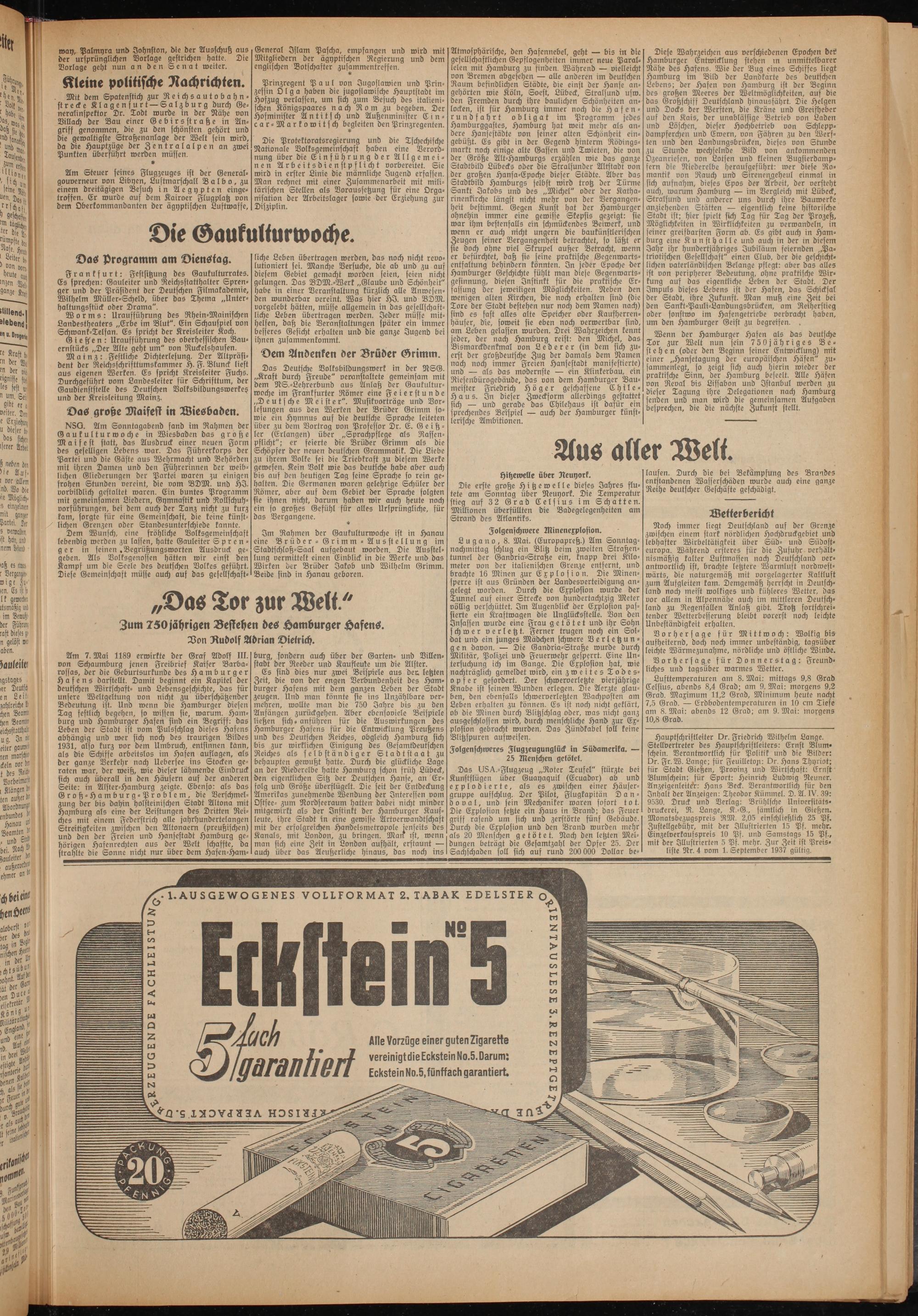 Hauptschriftleiter Dr. Friedrich Wilhelm Lange. Stelldertreter des Hauptschriftleiters: Ernst Blum» schein. Verantwortlich für Politik und die Bilder: Dr. Fr.W. Lange; für Feuilletop: Dr. Hans Thyriot; für Stadt Gießen, Provinz und Wirtschaft: Ernst Blumschein; für Sport: Heinrich Ludwig Neuner. Anzeigenleiter: Hans Beck. Verantwortlich für den Inhalt der Anzeigen: Theodor Kümmel. D. A. IV. 39: 9530. Druck und Verlag: Brühlsche Unioersitäts- druckerei, R. Lange, K.-G., sämtlich in Gießen. Monatsbezugspreis RM. 2,05 einschließlich 25 Pf. Zustellgebühr, mit der Illustrierten 15 Pf. mehr. Einzelverkaufspreis 10 Pf. und Samstags 15 Pf., mit der Illustrierten 5 Pf. mehr. Zur Zeit ist Preisliste Nr. 4 vom 1. September 1937 gültig.