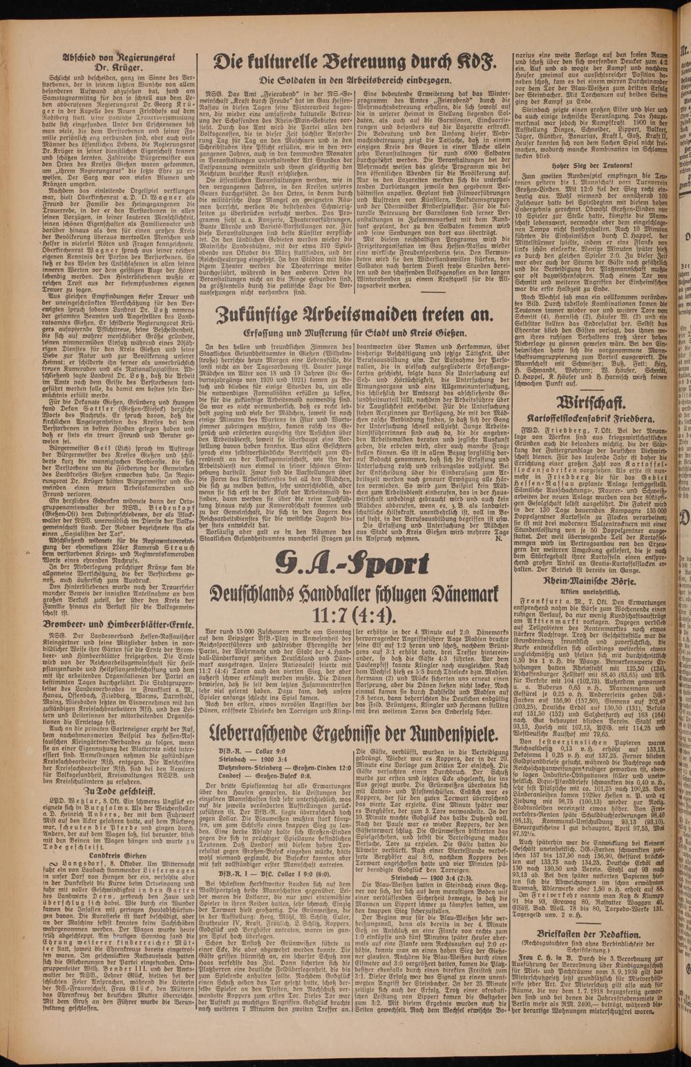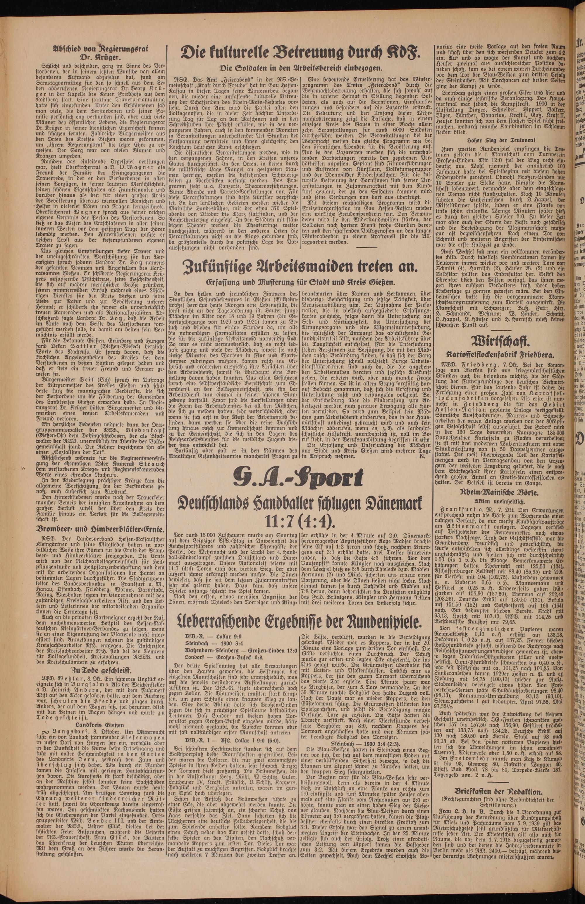 Bürgermeister Geil (Lich) sprach im Auftrage der Bürgermeister des Kreises Gießen und schilderte kurz die mannigfachen Verdienste, die sich der Verstorbene um die Förderung der Gemeinden des Landkreises Gießen erworben habe. In Regierungsrat Dr. Krüger hätten Bürgermeister und Gemeinden einen treuen Arbeitskameraden und Freund verloren.