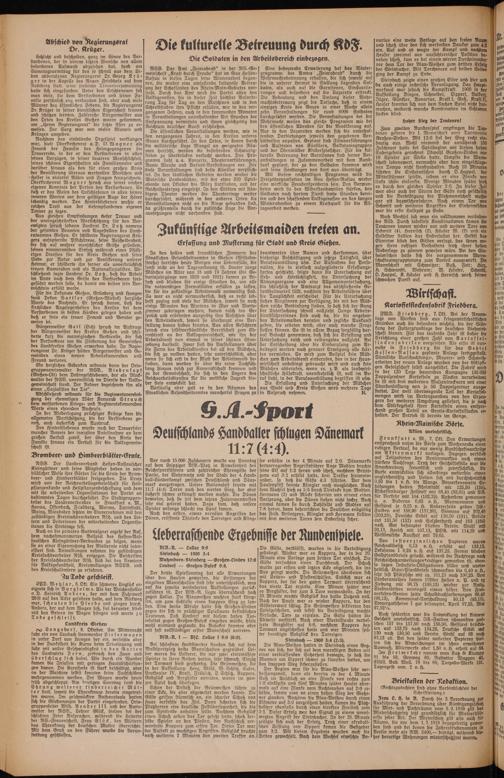 Vor rund 15 000 Zuschauern wurde am Sonntag auf dem Leipziger VfB.-Platz in Anwesenheit des Reichssportführers und zahlreicher Ehrengäste der Partei, der Wehrmacht und der Stadt der 4. Hand- ball-Länderkampf zwischen Deutschland und Dänemark ausgetragen. Unsere Nationalelf feierte mit 11:7 (4:4) Toren auch den vierten Sieg, der aber äußerst schwer erkämpft werden mußte. Die Dänen bewiesen, daß sie seit dem letzten Zusammentreffen sehr viel gelernt haben. Dazu kam, daß unsere Spieler anfangs schlecht ins Spiel kamen.