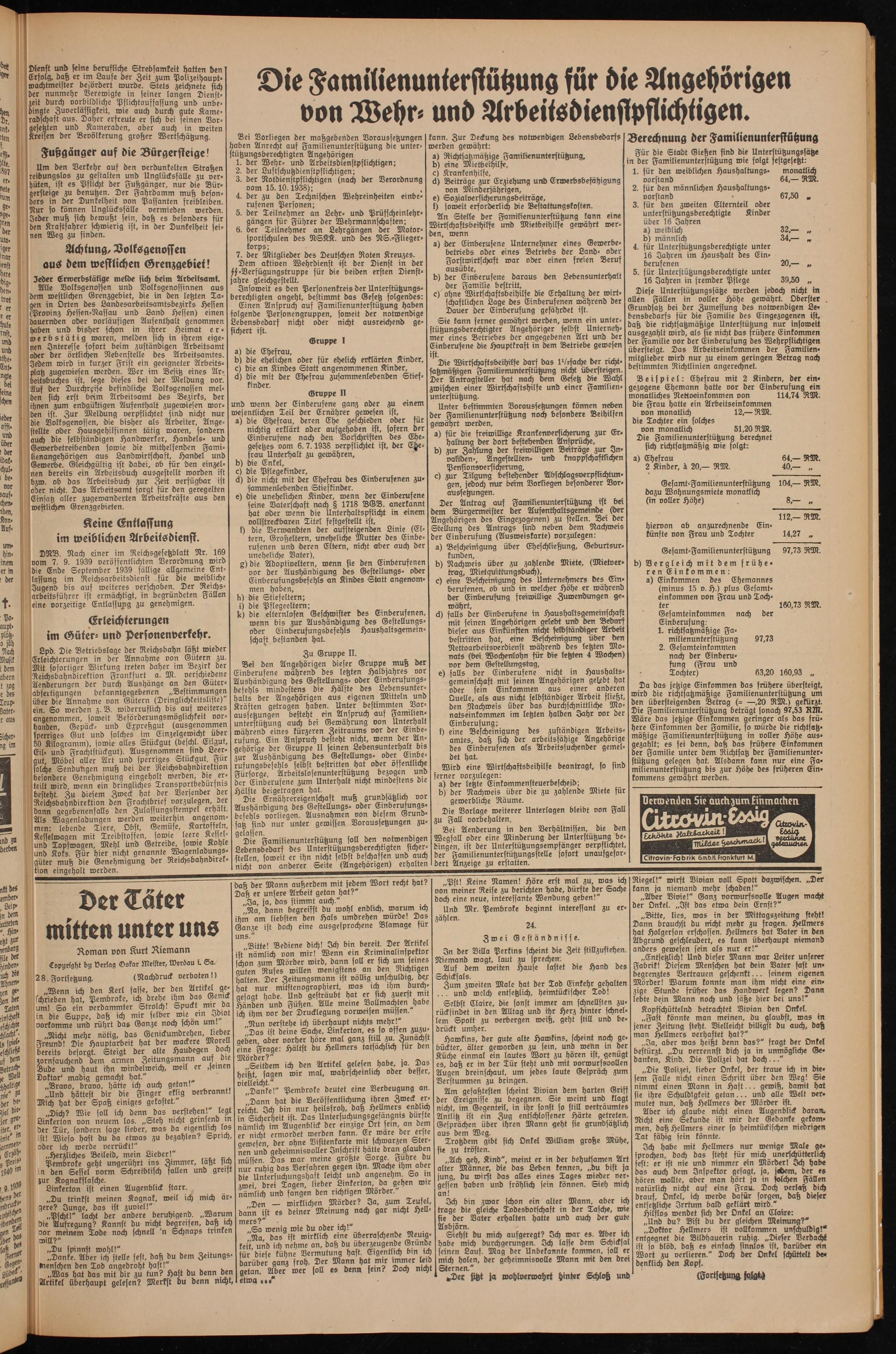 Alle Volksgenossen und Volksgenossinnen aus dem westlichen Grenzgebiet, die in den letzten Ta- aen in Orten des Landesarbeitsamtsbezirks Hessen (Provinz Hessen-Nassau und Land Hessen) einen dauernden oder vorläufigen Aufenthalt genommen haben und bisher schon in ihrer Heimat erwerbstätig waren, melden sich in ihrem eigenen Interesse sofort beim zuständigen Arbeitsamt oder der örtlichen Nebenstelle des Arbeitsamtes. Jedem wird in kurzer Frist ein geeigneter Arbeitsplatz zugewiesen werden. Wer im Besitz eines Arbeitsbuches ist, lege dieses bei der Meldung vor. Auf der Durchreise befindliche Volksgenossen melden sich erst beim Arbeitsamt des Bezirks, der ihnen zum endgültigen Aufenthalt zugewiesen worden ist. Zur Meldung verpflichtet sind nicht nur die Volksgenossen, die bisher als Arbeiter, Angestellte oder Hausgehilfinnen tätig waren, sondern auch die selbständigen Handwerker, Handels- und Gewerbetreibenden sowie die mithelfenden Familienangehörigen aus Landwirtschaft, Handel und Gewerbe. Gleichgültig ist dabei, ob für den einzelnen bereits ein Arbeitsbuch ausgestellt worden ist bzw. ob das Arbeitsbuch zur Zeit verfügbar ist oder nicht. Das Arbeitsamt sorgt für den geregelten Einsatz aller zugewanderten Arbeitskräfte aus den westlichen Grenzgebieten.