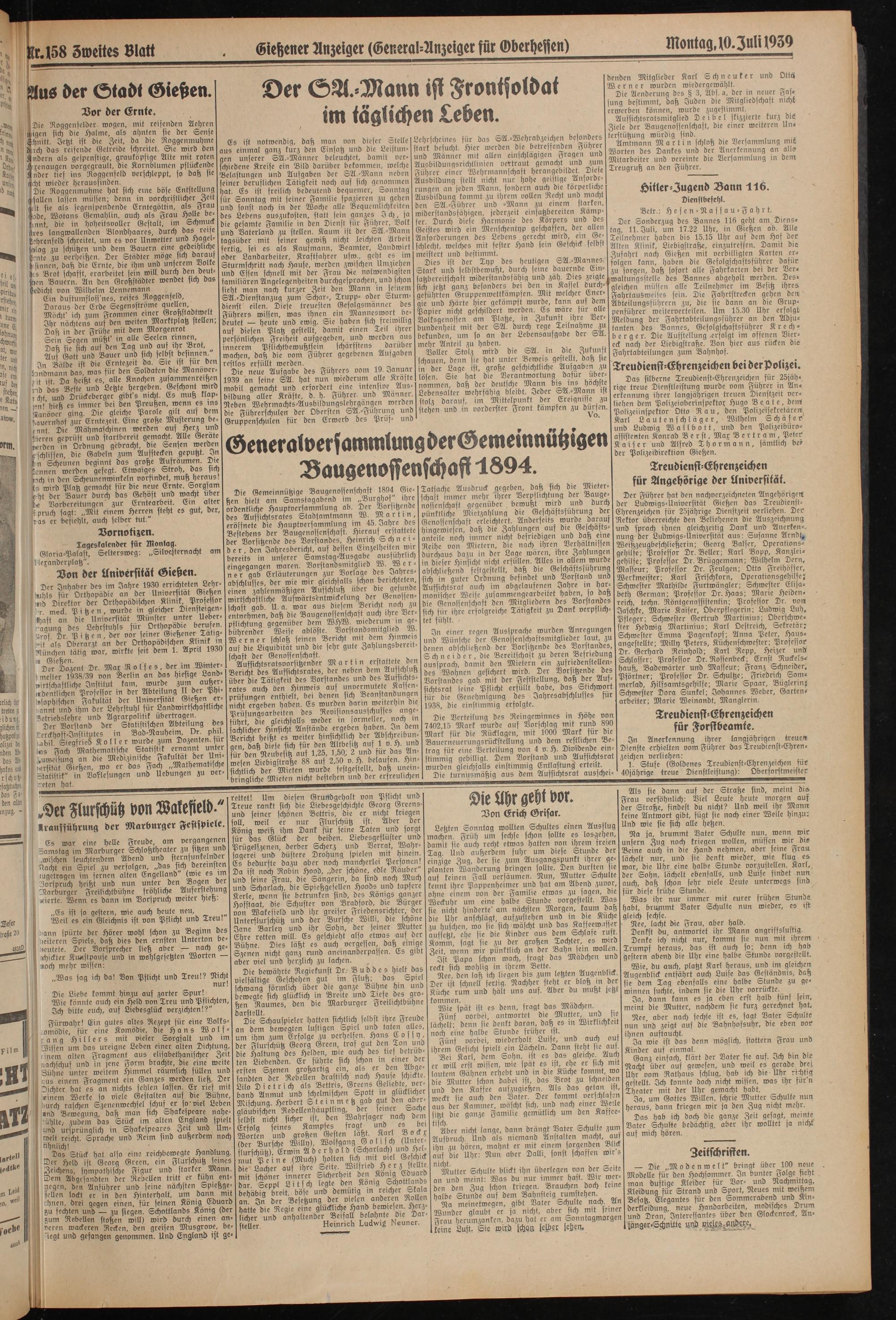Ausbildungsrichtlinien vertraut gemacht und zum Führer einer Wehrmannschaft herangebildet. Diele Ausbildung stellt nicht nur hohe geistige Anforderungen an jeden Mann, fonbern auch die körperliche Ausbildung kommt zu ihrem vollen Recht und macht den SA.-Führer und -Mann zu einem starken, widerstandsfähigen, jederzeit einsatzbereiten Kämpfer. Durch diese Harmonie des Körpers und des 2)Gr Sonderzug des Bannes 116 geht am Diens- Geistes wird ein Menschentyp geschaffen, der allen ^g, 11. Juli, um 17.22 Uhr, in Gießen ab. Alle Anforderungen des Lebens. gerecht wird, ein Ge- Teilnehmer haben bis 15.15 Uhr auf dem Hof der schlecht, welches mit fester Hand fein Geschick selbst Alten Klinik, Liebigstraße, einzutreffen. Damit die meistert und bestimmt. Zufahrt nach Gießen mit verbilligten Karten er-
