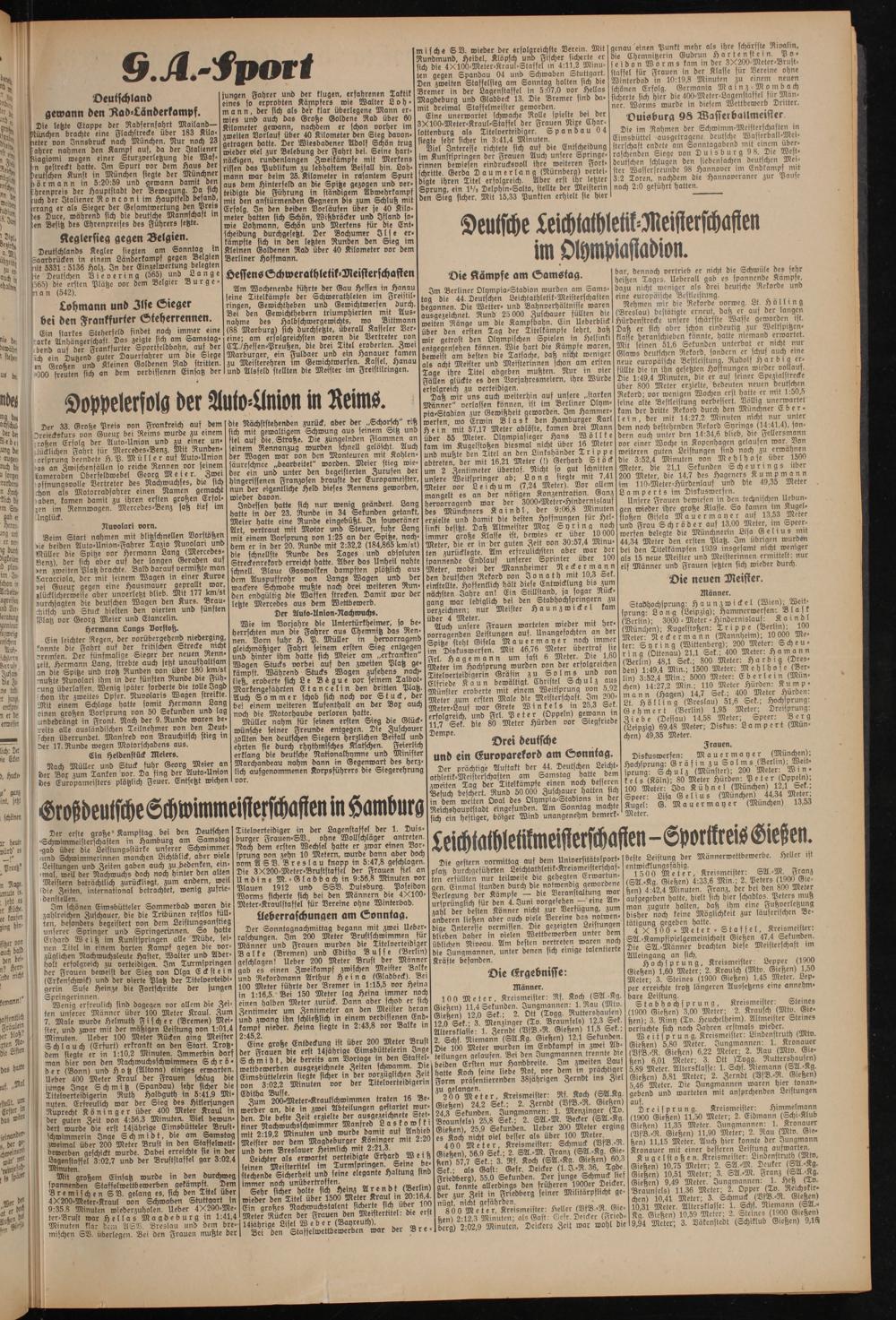 4 00 Meter, Kreismeister: Schmuck (DfB.-R. Gießen), 56,9 Sek.; 2 SA.-M Franz (SA.-Kg Gießen) 57,7 Sek.: 3. Rf. Koch (SA.-Kg. Gießen) 60,3 Sek- als Gast: Gefr. Deirfer (1- J«R. 36, Tgde. Friedberg), 55,0 Sekunden. Der junge Schmuck lief aut konnte allerdings den früheren 1900er Deicker, der zur Zeit in Friedberg seiner Militärpflicht genügt. nicht gefährden. -