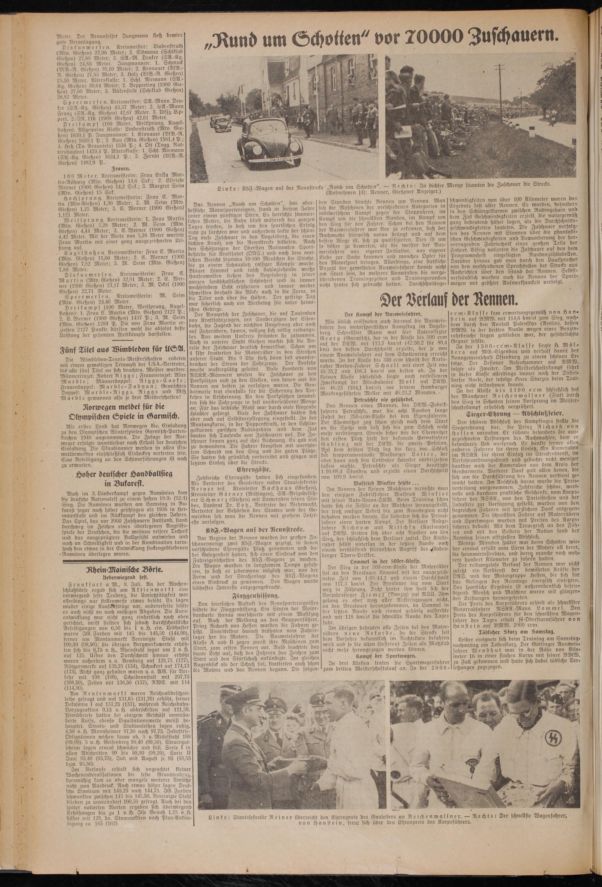 Wie üblich eröffneten auch diesmal die Ausweisfahrer den motorsportlichen Kampftag im Vogelsberg. Schnellster Mann war hier Unteroffizier Georg (Garmisch), der in der Klasse bis 500 ccm auf der DKW. mit 112,7 km/st (42:50,2 für 80,4 km) den besten Durchschnitt erzielte, der je von einem Ausweisfahrer auf dem Schottenring erreicht wurde. In der Klaffe bis 350 ccm schnitt der Karlsruher Norton-Fahrer Schnell mit einer Zeit von 45:25,2 und 106,3 km/st am besten ab. In der kleinen Klasse schließlich siegte nach verbissenem Zweikampf der Wiesbadener Wolf auf DKW. in 46:23 (104,1 km/st) vor seinem Hamburger Markengefährten Meller mit 46:23,2 Minuten.